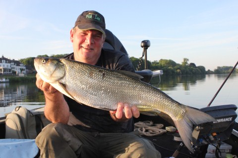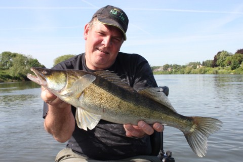 Lambert is de gelukkige eigenaar van een waanzinnige Marcraft 440 Pikemaster, met alle toeters en bellen er op en er aan. Ons “plan de campagne” was al ruimschoots van tevoren gemaakt. We gaan vandaag vooral heel veel werpend vissen. Een onderdeel van het roofvissen dat we beiden het allerliefste doen. De stekken zijn bekend, binnen een mum van tijd zijn we ter plaatse. Net zo snel heeft Lambert de I-Pilot in stelling gebracht en staan we kaarsrecht op de hard stromende rivier. Tergend langzaam manoeuvreert de Minnkota ons stroomopwaarts. Je hebt er als visser geen omkijken meer naar. Echt whow!! We bevissen een ondiepe plaat waar amper een meter water staat. Onze ervaring is dat veel rovers deze ondieptes bevolken, zeker in de vroege zomer en zeker op dit tijdstip. Het was een tijd geleden, maar na een paar inworpen weet ik weer waarom ik roofvissen zo fantastisch vind. Het relaxte karakter van de bootvisserij , gecombineerd met een zeer actieve en intensieve manier van vissen geeft een enorm lekker gevoel. Het vist gewoon prettig op deze manier. De stoel voelt aan als een design fauteuil, heerlijk……na tien minuten werpen met de shad hangt mijn broer de Spro Aruku aan zijn hengel. Al snel blijkt dat dit een gouden greep is. Binnen een paar worpen staat zijn St Croix hengel in de gevechtshouding. Met een enorme klap heeft een vis de ratelaar gegrepen. Vijf minuten later blijkt dat de eerste vis van de dag een prachtige 70er roofblei is. Voor de zekerheid scheppen we deze vis met het net. Deze is te mooi om niet om op de foto te zetten.