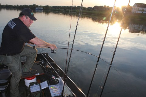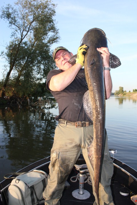 Even later vang ik ook een roofblei, alleen moet deze nog een paar jaar doorgroeien. De aanbeet was er echter niet minder spectaculair om. Het begin van de dag is goed. We genieten beiden volop. Alles zit vandaag mee. Het weer is top, er staat een stevige stroming en de kleur van het water staat ons ook erg aan. Geen aquariumwater, maar licht gekleurd…..daar hebben we alle twee de beste ervaringen mee. Een paar baarzen later zie ik vanuit een ooghoek hoe broerlief de “aruku” strak tegen de oever werpt. Op het moment dat het kunstaas het wateroppervlak raakt en hij twee slagen heeft binnengedraaid ontploft het water. Wat is dit? Al vrij snel wordt duidelijk dat Lambert een grote vis heeft gehaakt. Gedecideerd meldt hij me dat het om meerval gaat. De vis wekt de indruk dat hij niet in de gaten heeft in dat ie in verbinding staat met de hengel van mijn broer. Rustig zwemt het ogenschijnlijke monster stroomopwaarts. Richting het diepe water. We kunnen voorlopig niet meer doen dan kijken en stand houden. Dan wordt de vis wakker en versnelt. Instinctief wordt de beslissing genomen om de achtervolging in te zetten met onze boot. Even denk ik terug aan Jaws 1. Beiden zijn we onder de indruk van het geweld. Ik geniet met volle teugen mee met de dril van Lambert. Dit is echt ongelofelijk mooi. Bijgevoegd een deel van de dril op film Als de meerval de diepte in duikt gaat het gevecht als snel over in een worsteling die zich op vijf meter diepte onder de boot afspeelt.