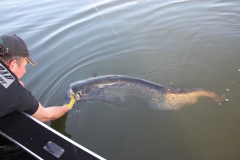 Een stuk van de dril film ik. Achteraf heb ik er spijt van dat ik niet de hele dril op film heb staan. Ik wilde deze vis echter kost wat kost zelf landen. Ik kon dus niet blijven filmen. Het geeft een enorme kick om je hand in de bek van zo’n killer te stoppen. Als de meerval na een dik kwartier voor het eerst aan het wateroppervlak verschijnt, weten we een ding zeker. Op de Nederlandse Maas hebben wij nog geen grotere “ live” gezien. De lat zegt 150 cm . Exact.