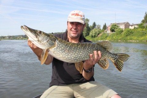 De oerkreet van mijn oudste broer zegt alles. We zijn klaar voor vandaag. Alles wat nu nog komt is meegenomen. We zetten op het gemak koers richting een andere strook rivier waar we in het verleden succesvol zijn geweest. De tot favoriet gebombardeerde Aruku blijft bij mijn broer aan de speld hangen. Ik schakel zelf over naar een jerkbait. Ik hang de gele toppie aan mijn onderlijn. Staand gooi ik de oevers uit, op zoek naar een rover. Lambert werpt constant de ratelaar ver in en vist hem tergend langzaam over de rivierbodem binnen. Als snel vangt hij een paar prachtige snoekbaarzen achter elkaar. Dan wordt het een tijdje stil. Vlak langs een leliebed ploft mijn toppie op het water. Ik laat het kunstaas een beetje zinken en geef een paar venijnige tikken op de handgebouwde Co Sielhorst Jerkbaithengel. Een hengel die ik koester…met recht! Als een donderslag bij heldere hemel klapt er een mooie vis op de fluo gele toppie. Het blijkt een mooie snoek te zijn. Een korte , maar heftige dril volgt. ik voel me de koning te rijk als ik met mijn vangst op de foto kan.
