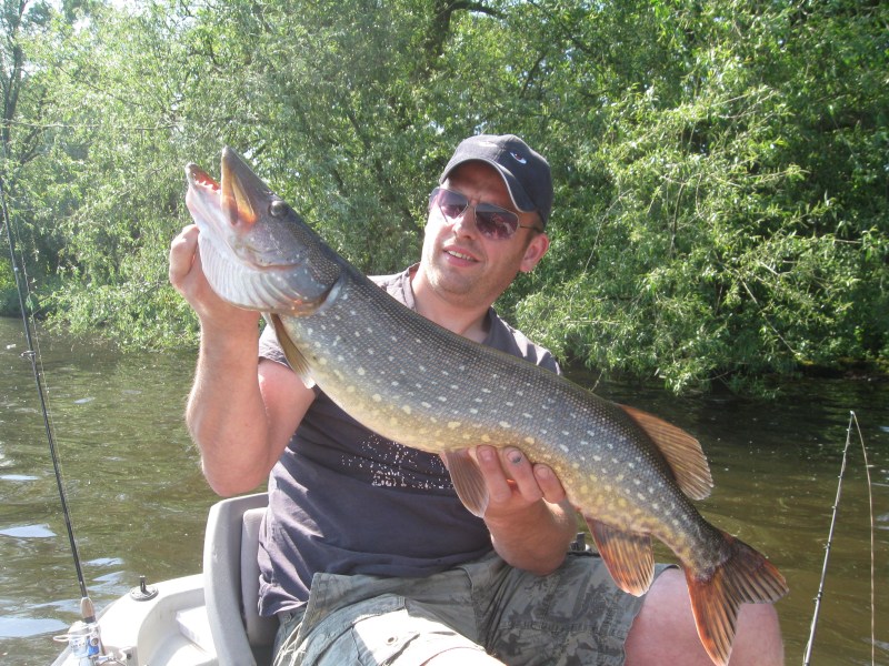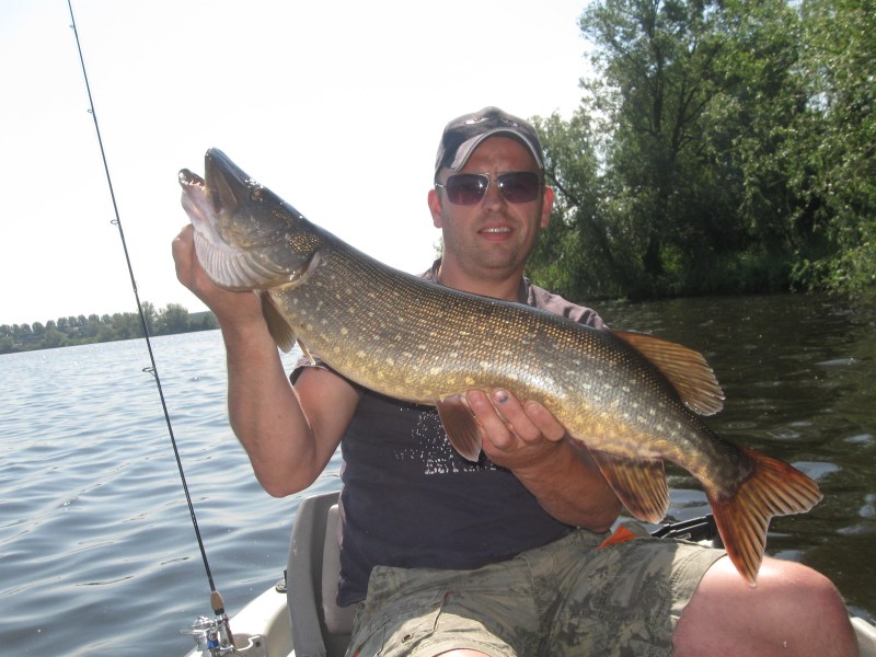 We zetten de teller op 17 snoekbaarzen en een snoek.Trollen maar weer,nu is het Eric zijn hengel die mooi krom gaat staan.Een ware water-acrobaat probeert alles om de blauwe pikefighter kwijt te raken.Met sprongen compleet boven water en een paar duiken in de diepte,lukt het hem helaas niet.In de boot ermee,foto en terug.Daarna jerken we met de Spro Rapper en Busterjerk nog wat lelievelden uit,maar dat levert niets op.
