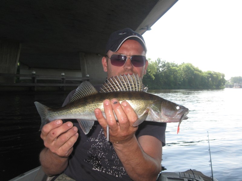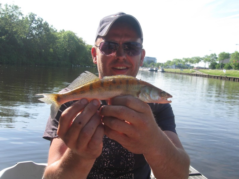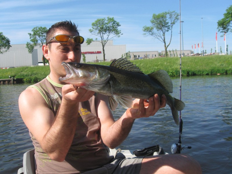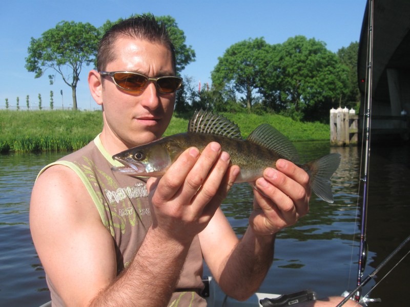 Een perfecte dag,dat was het vandaag.Vroeg in de morgen al lekker temperatuurtje,niet te druk op het water en het seizoen is weer begonnen.Vandaag zijn we (Eric en ik) naar een ,voor mij, nieuw water geweest.In de auto bespreken we wat we zullen gaan doen vandaag.Trollen,dropshotten en jerken.Om op alle manieren te proberen de rovers te verleiden tot een dikke aanbeet!Eénmaal op het water beginnen we met trollen.Eric bindt een Pikefighter aan het eind van zijn lijn,ik besluit een hornetje te pakken.Mooi langs de lelievelden tutteren om tenslotte op groter water uit te komen.Het eerste half uur komen we geen vis tegen,het tweede trouwens ook niet....Als we bij een viaduct aankomen moeten de dropshot shads maar voor vis gaan zorgen.We hopen op een baarsje,om in ieder geval iets te vangen...Beide krijgen we wat tikken,driften nog ene keer op en neer,en dan is het Eric die de score mag gaan openen.Een klein fel snoekbaarsje heeft de shad gepakt.De shads gaan weer te water,en vrijwel meteen is het weer raak.Dit is een betere,aan de hengeltop te zien.De Go Pro gaat overboord en ik start met filmen.Onze ruwe glasoog poseert een keer voor de lens en besluit er weer van door te gaan.Schitterend!! Ook de release van de vis wordt op film vastgelegd.Na deze ben ik aan de beurt,op mijn 3-14 grams Spro dropshothengeltje van 1.80 meter is het puur genieten,wat is dit geweldig.Dropshottend heb ik vele vis gevangen,maar recht onder de top vanuit een driftende boot geeft toch iets extra.