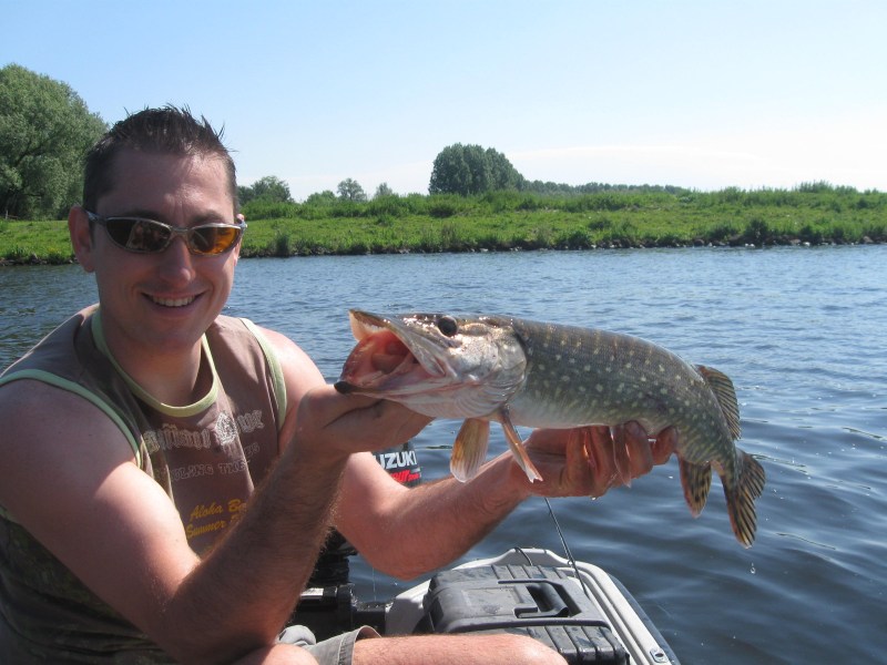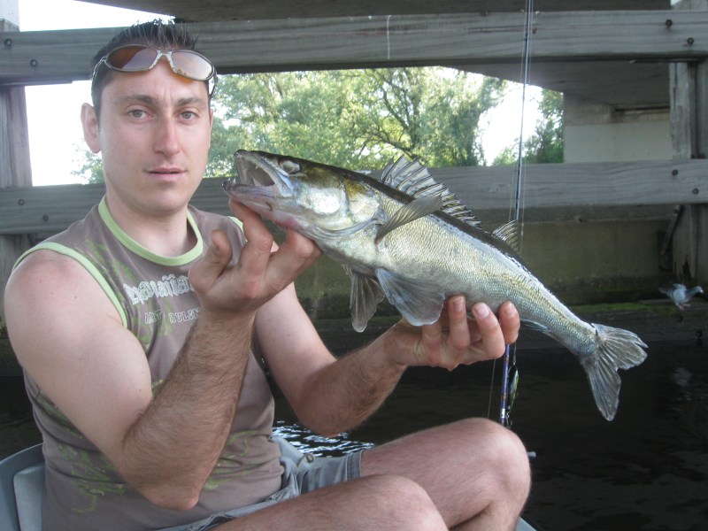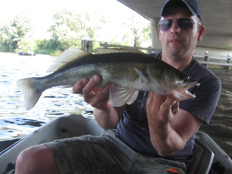 We vangen onder deze eerste brug een 8 snoekbaarzen,en besluiten dan om weer een stuk te gaan trollen.Beide op snoek,Eric weer zijn Pikefighter en ik nu de Triple Devil.Na een 300 meter is het raak,een 82 cm volle vis komt naar boven,vlug onthaken,foto,en terug.Met dit weer kun je niet snel genoeg zijn.De snoek duikt weer de diepte in en we gaan weer door,het blijft effe stil op de hengels...Dan maar effe lunchen,de Javaanse gehaktballen met zaanse mayo gaan er goed in.We genieten effe van de zon en duiken vervolgens weer onder een viaduct.En wéér is het goed raak,kleine maar ook verschillende mooie snoekbaarzen komen effe de boot in voor wat zonneschijn,om vervolgens weer de donkere diepte in te duiken.Puur genieten is dit,wat een aanbeten op die lichte toppen!