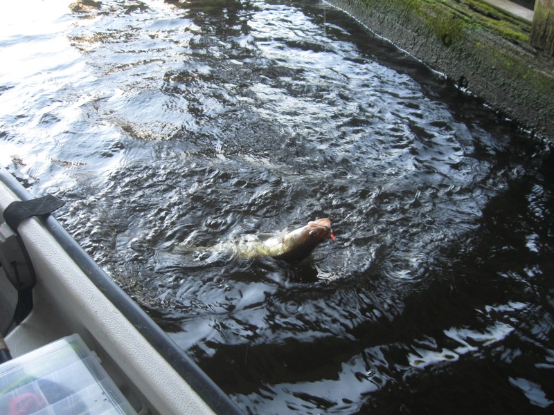 Het is in de middag en we besluiten nog wat broodjes te nuttigen aan een steiger,in het zonnetje.Het plan is voor ons beide hetzelfde..De Viaducten nog een keer afstruinen naar snoekbaars.En dat lukt,we vangen in totaal 21 snoekbaarzen over de hele dag.Ik pak nog een baarsje en op de terugweg nog een snoek op een spinnerbait langs de lelievelden.Met 25 vissen totaal traileren we de boot weer en gaan op huis aan.Nieuw water is altijd een gok,maar vandaag gokten we goed!!