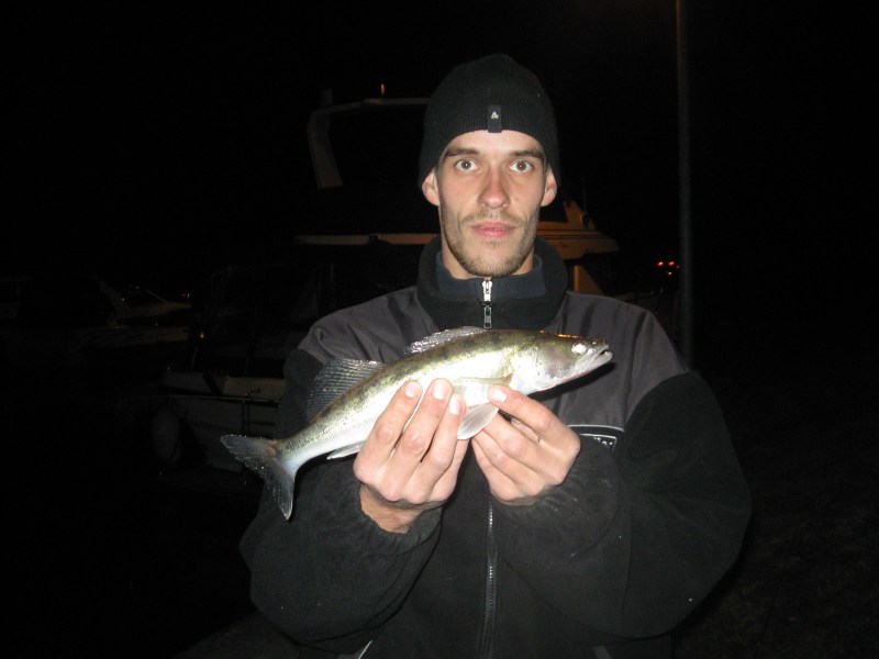 De laatste tijd zijn we helaas (noodgedwongen) in de avond op rovers aan het jagen.Het wordt weer kouder en donker vroeg in de avond.Maar geluk hebben we met het feit dat de haven en aanmeerstukken voor de schepen verlicht zijn.Zo zijn we een aantal keer al weesten vissen met de dropshot,en kleine hornets.Nicky is gister na 2,5 maand ook weer is meegeweest.Zijn eerste worp leverde meteen een snoekbaars op.Daarna nog wat baarzen,Ralf had er van de week één van 30 cm op de hornet.