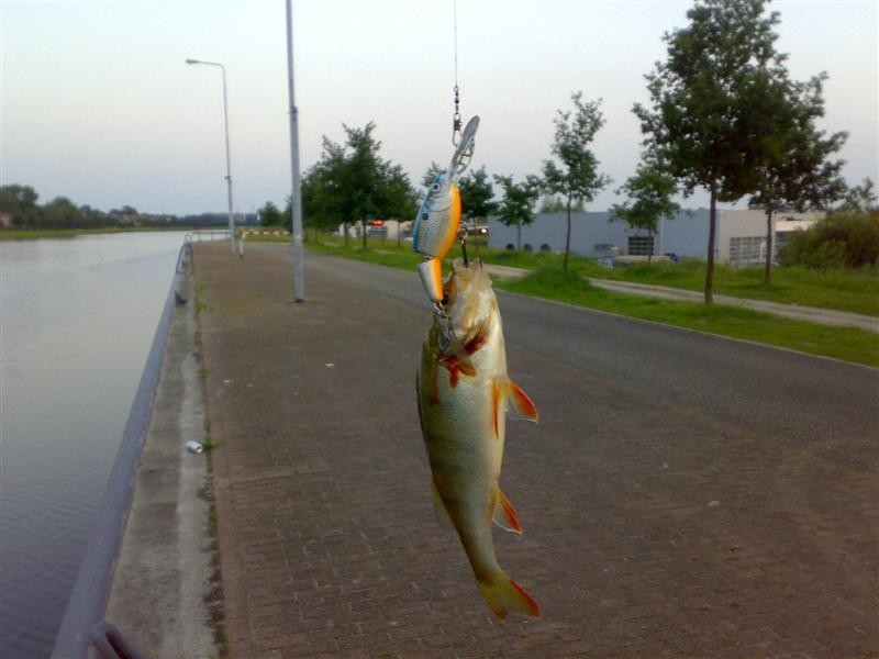 Na het eten ben ik even gaan vissen op het kanaal in Helmond. Even de kade afgeworpen opzoek naar snoekbaars met een Rapala jointed shadrap maar dat leverde geen snoekbaars op maar een klein baarsje. Daarna heb ik een stuk verderop langs de kant waar het kanaal langzaam afloopt in het diepe en bezaaid ligt met keien geworpen met een zilveren mepps streamer maatje 3.