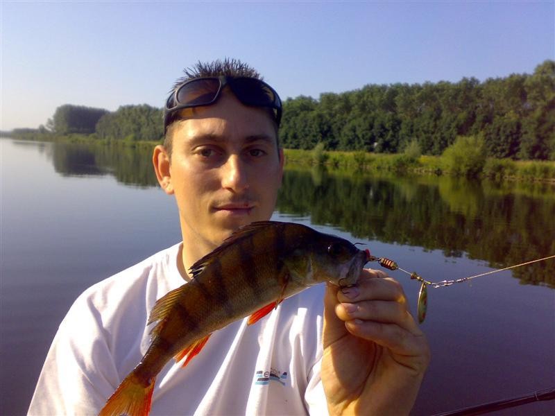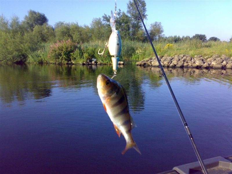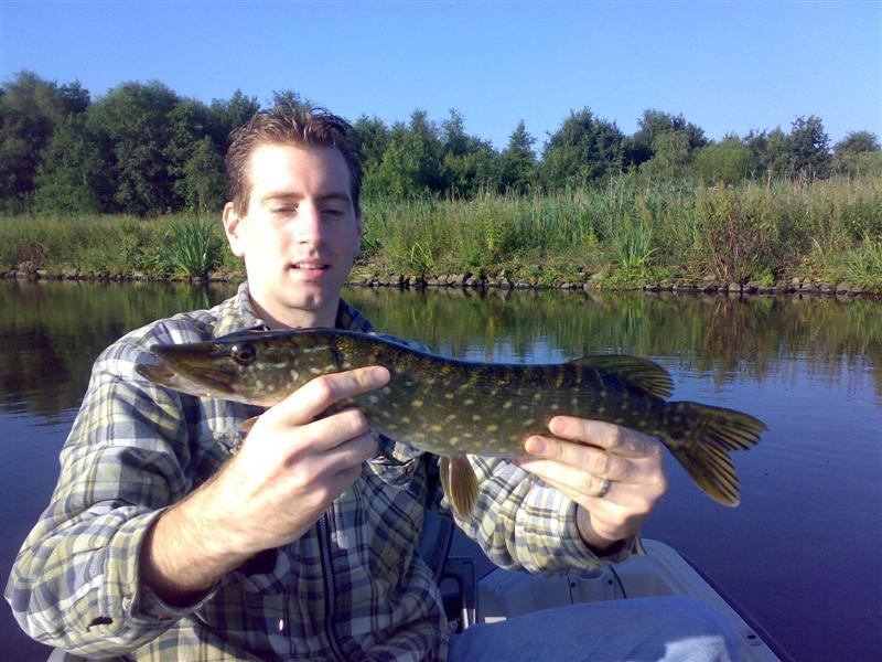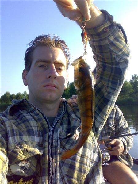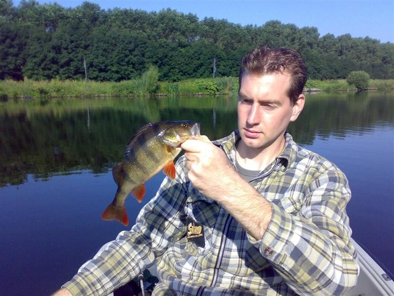 Als snel lag de eerste baars in de boot gevangen aan een Rapala Jointed Shadrap. Al snel stapte we allebei over op de Mepps Streamer nr.3. (goudkleur). Dit bleek vandaag wederom een Baars killer te zijn. Bas wist er zelfs een mooi Snoekje mee te haken.