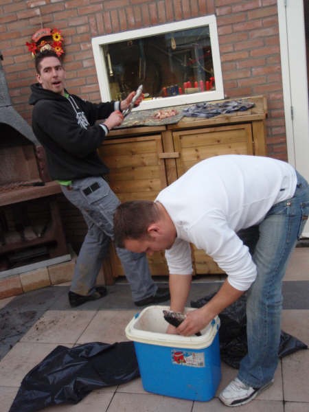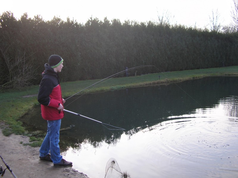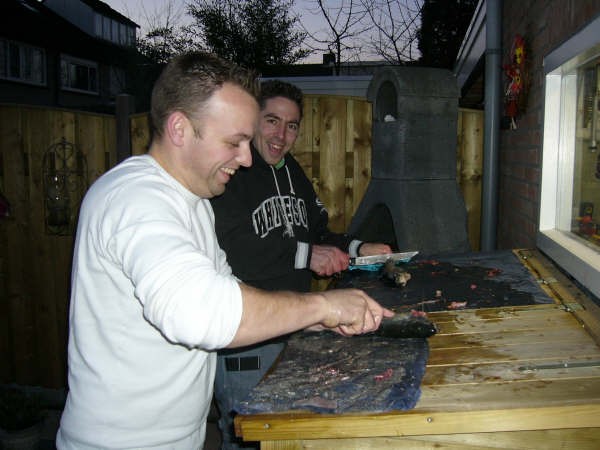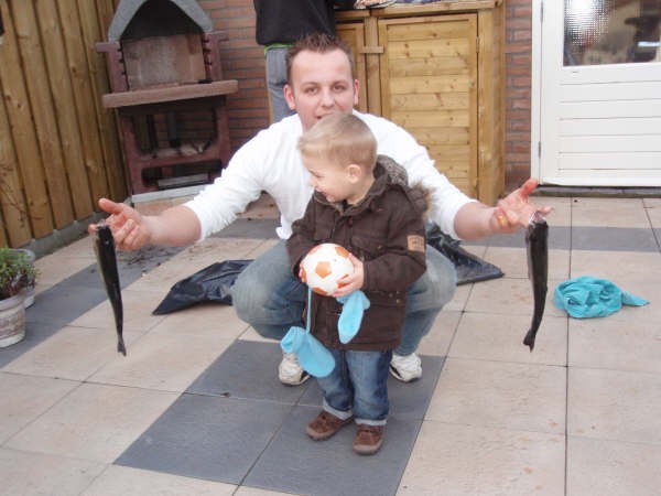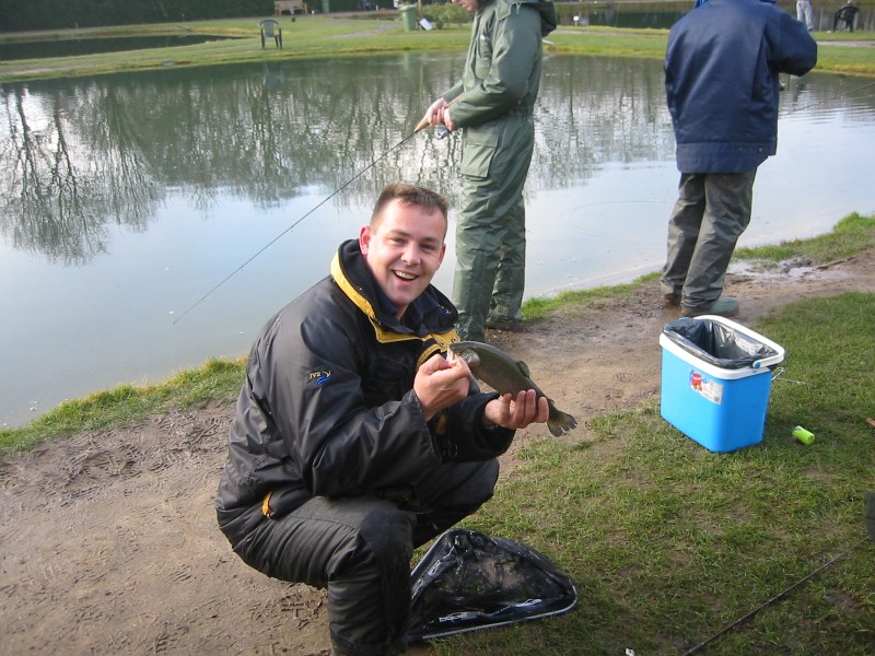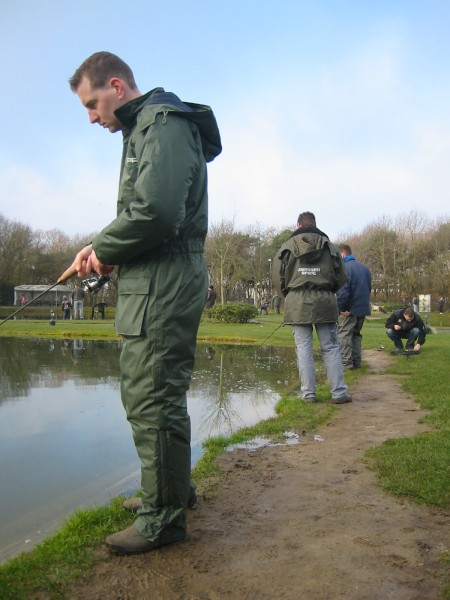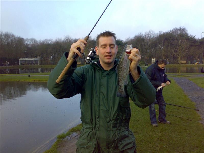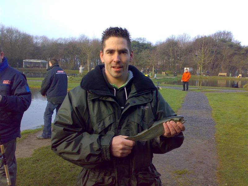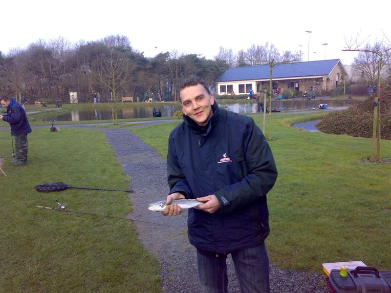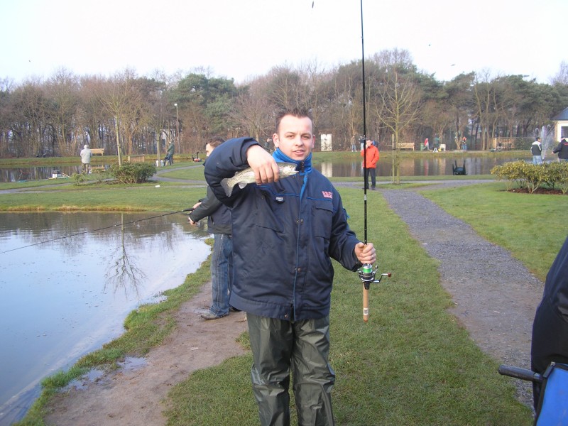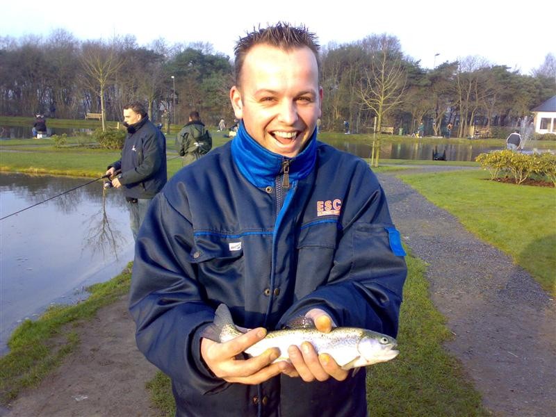Vandaag zijn we met de hele meute gaan vissen op forel bij de maashof. Twee nieuwe 'vismaten' Rene en Bart waren ook van de patij (We vonden het erg gezellig heren en hopen jullie nog vaker te zien). We hadden voor 120 euro een vijver afgehuurd waar 50 forellen en 1 zalmforel op werden uitgezet. Voordat de vis erin werd gezet hadden we echter al 8 achterblijvers in de koelbox liggen.