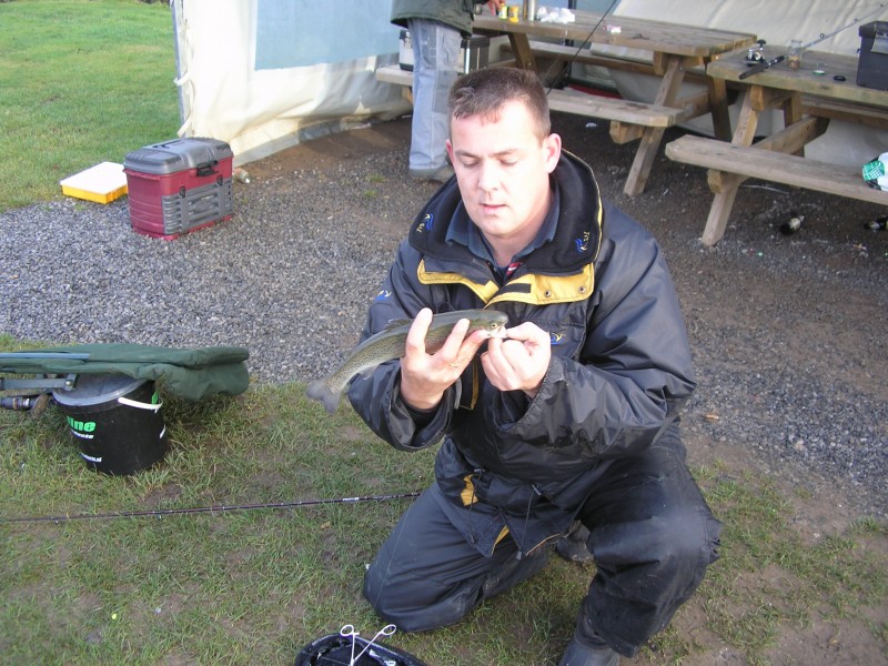 Uiteindelijk vingen we 54 forellen uit de vijver met 9 man.