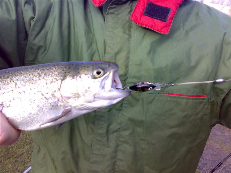 We hadden een prachtige dat vol met zon en weinig wind, heerlijk. Ook wist iedereen een visje te vangen. Wat opviel was dat de vissen heel afwisselend beten op powerbait, dan weer op pluggen, dan weer op wormen en uiteindelijk weer op de powerbait. Verandering van spijzen doet eten zullen we maar zeggen. Maar het was wel opvallend. Voor het vissen met powerbait gebruikten we een hele simple montage. Een schuifloodje van 1 tot 3 gram dan een wartel en dan een onderlijn met haak met powerbait erop. Heel licht maar uiterst effectief omdat de forellen vaak met koud weer wat dieper zitten en de montage heel weinig weerstand heeft. Wanneer je merkt dat de forel het aas neemt even wat lijn geven en dan de haak zetten. Kan niet misgaan. Door de ontdekking van deze manier van vissen vorig jaar, hebben we denk ik dit jaar weer zo goed gevangen.