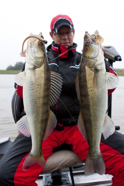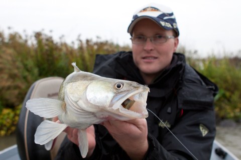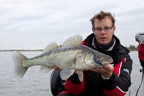 Vandaag met Roel Trum op pad, voor mij al ruim 3/4 jaar geleden dat ik voor het laats met hem op pad was gegaan. Nu stonden onze gedachte's alleen maar gericht op Koffie kleur water en grote snoekbaars. Aangekomen aan de helling zagen we de rivier al goed kolken, na de regenval van de laatste tijd moest de rivier wel koffie kleur hebben. De eerste stek werd goed uit gevist maar leverde mij maar 2 kleine herringen op. Snel vertrokken we na een ander stuk op de rivier waar we net wat uit de wind lagen, aangekomen begon het goed te regenen en ook goed hard te regenen. harde koude wind en regen das geen doen zeg. Gelukkig bij de eerste drift kreeg ik een snoek harde aanbeet, ik had mijn HT motor oil tottershad ingeruild tegen een maat groter de HT Big Nando ook in de kleur motor oil, een shad van maar liefst 18 cm lang met een super actie in de staart, met een mooie flank beweging voelt de snoekbaars dit al van een afstand aankomen. een mooie hogen 60+er komt de boot in. Op de foto kun je goed zien hoe hard deze aanbeten kunnen zijn, SPIJKER hard en ver achter in de bek.