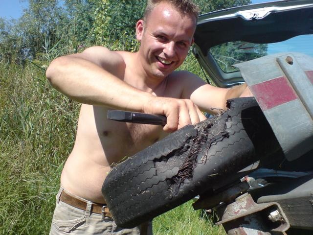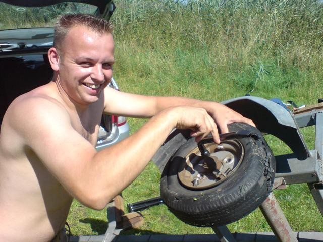 Ik zei woensdag thuis nog dat ik even naar de sloperij ging kijken of ik een bandje kon vinden voor de trailer.Omdat ze er daar geen hadden,gingen we maar op goed geluk,wat kon er immers fout gaan met een uitgedroogde afgesleten band haha.met een paar scheurtjes erin.