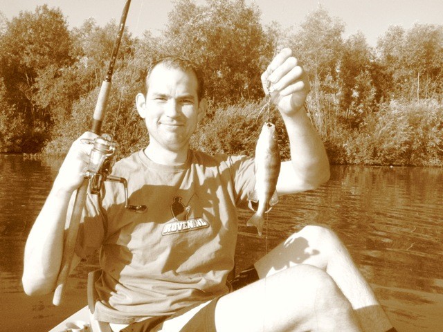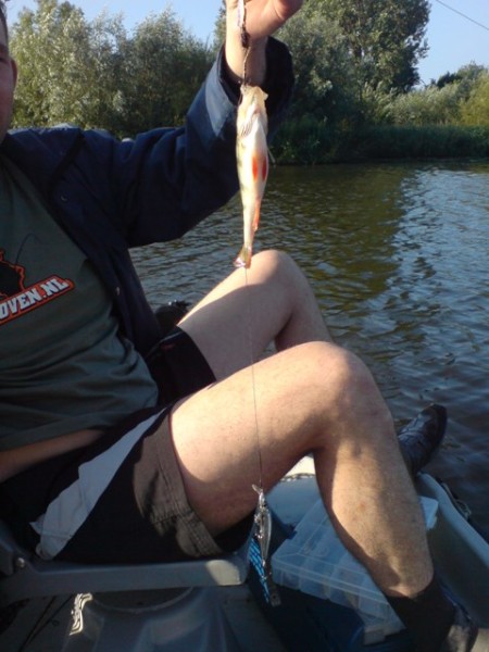 Trollen dan maar.Patje heeft een mooie creatie uitgevogeld en het blijkt nog te vangen ook want niet veel later vangt hij ook zijn eerste baars.Het is een mix van twee soorten kunstaas,aan de 1e stalen onderlijn komt een mepps aglia streamer met een extra onderlijn,en daaronderaan komt een plug.Dus je vist met één hengel met 2 sooten aas.Tevens gaat de streamer dieper het water in door de plug.Als we een eindje verder trollen hoor ik JOOOO HANGEN GAST!!!Een dikke snoek,denken wij, heeft zich vergrepen aan de aantrekkelijke combi van Patje.Maar.......hij lost zichzelf@#!#