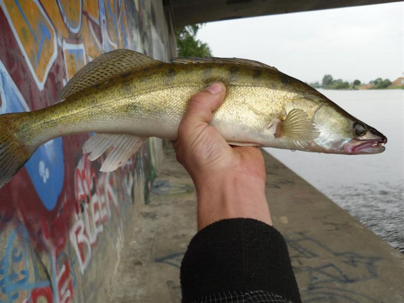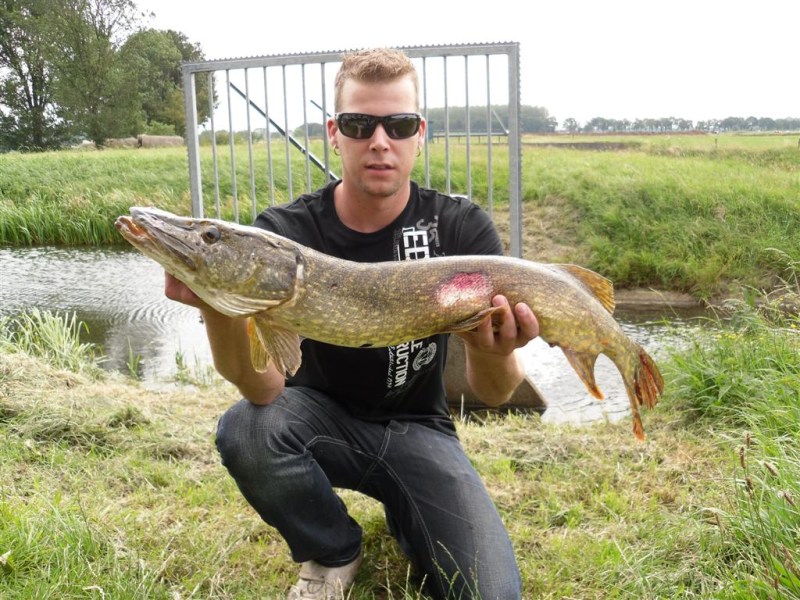 stuk wetering in Beuningen af te vissen, met jerkbaits en groot rubber hopend om veel vis te zien. Het water was voor mijn nog onbekend maar kwam er al heel snel achter dat het niet dieper was dan 70 cm en dat er gruwelijk veel waterplanten in stonden , na 25 worpen met de Busterjerk 2 en 50 meter slierten aan de haak besloot ik maar om mijn baby buster er aan te doen. Na een kleine 2 uur geen aanbeet of vis gezien te hebben en regelmatig van kunstaas gewisseld te hebben besloot ik een stukje verder te rijden en bij een sluis te gaan kijken. Aangekomen bij de sluis zie ik door mijn polaroid zonnebril een mooie snoek liggen, ik schatte hem rond de 75 cm. Mijn hard begon te bonken en dacht die moet ik vangen, na hem rustig van achter benaderd te hebben gooi ik de kleine bulldog eroverheen en draai en tik hem rustig binnen, ik zie de snoek in de aanval houding gaan hangen en op het moment dat het aas hem passeert schiet hij er als een speer van door. Verdorie dacht ik, dat was de kans maar helaas. Snel nog een paar keer rond gooien maar levert niks op. Op dat moment begint het nog te regenen ook en dacht dit word een visloze natte dag.