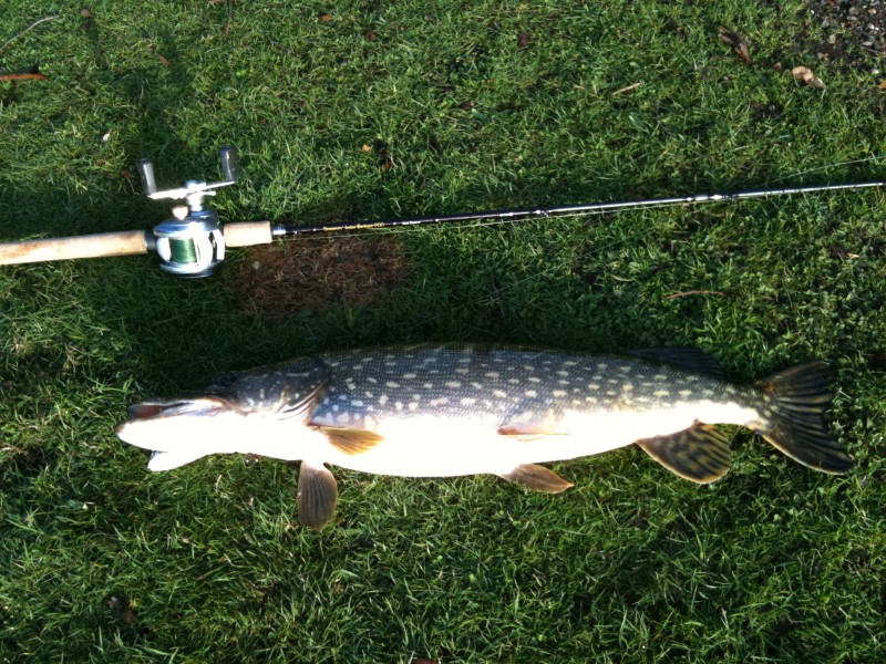 Het is inmiddels al 8:43 uur en wil er net mee ophouden als een snoek de swimbait vol pakt. Hangen! Mijn eerste snoek dit jaar, "als hij er maar niet afschiet" gaat door mijn hoofd. Gelukkig zit hij goed gehaakt en met een geslaagde kieuwgreep leg ik de snoek voorzichtig op het natte gras. Een snelle foto en dan veilig terug in het water. Yes!!