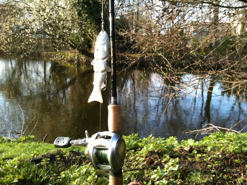 De nog opgetuigde hengel met mijn nieuwe revo toro en mijn 6 inch swimbait komen achter uit de klep, onthaaktang in de kontzak en vissen maar.