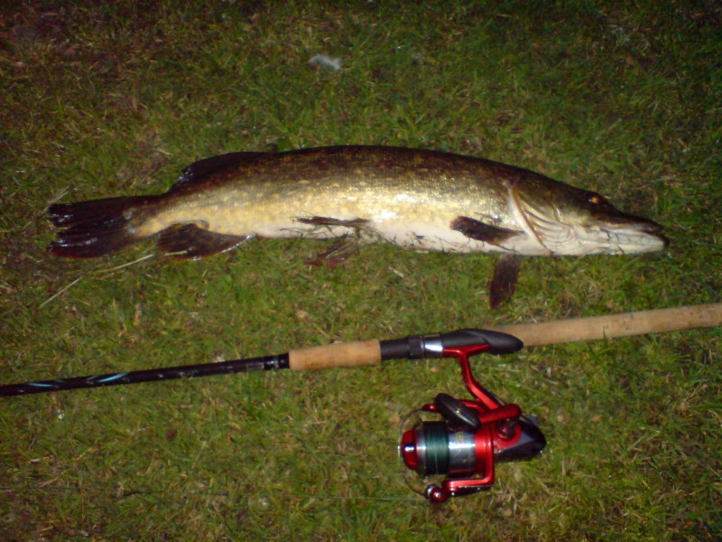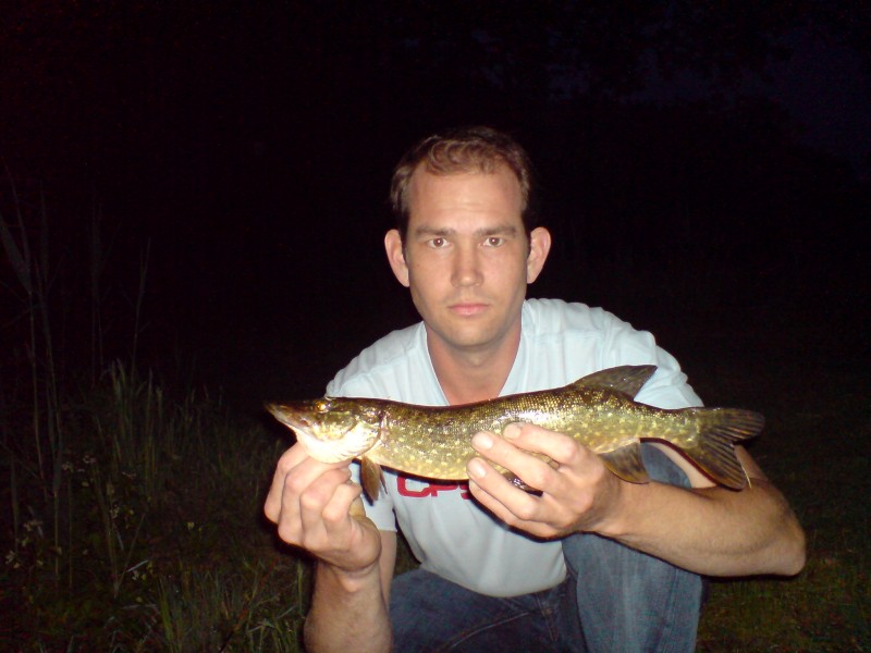het werd de nieuwe chroom kleurige slanke salmo plug op deze plug kreeg ik meteen een goeie aanbeet die losschoot,vlak daarna weer een goeie beet en dit was een moeie snoek van ongeveer 80 centimeter deze ving ik al bijna in het donker