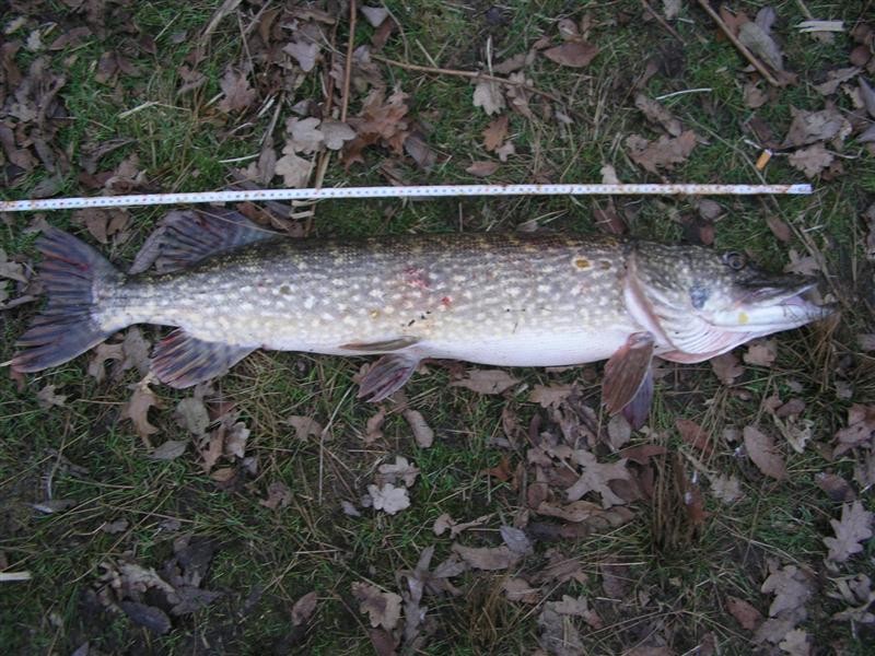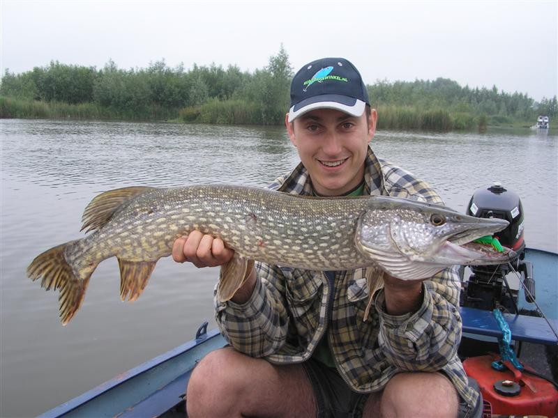 Patrick ging huiswaards en ik besloot het nog even te proberen op de Phillipsvijver in Veldhoven. Na de eerste stek te hebben uitgekamt ga ik naar de volgende. Hier gooi ik mijn blauwe Arukashad weer uit en het is meteen raak. De vis neemt een aantal felle runs en na een zenuwslopende dril weet ik de Snoek van 98cm. te landen in het net. Het is voor mij m'n P.R. dus mijn dag kan niet meer stuk!!!!