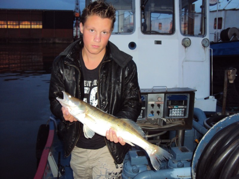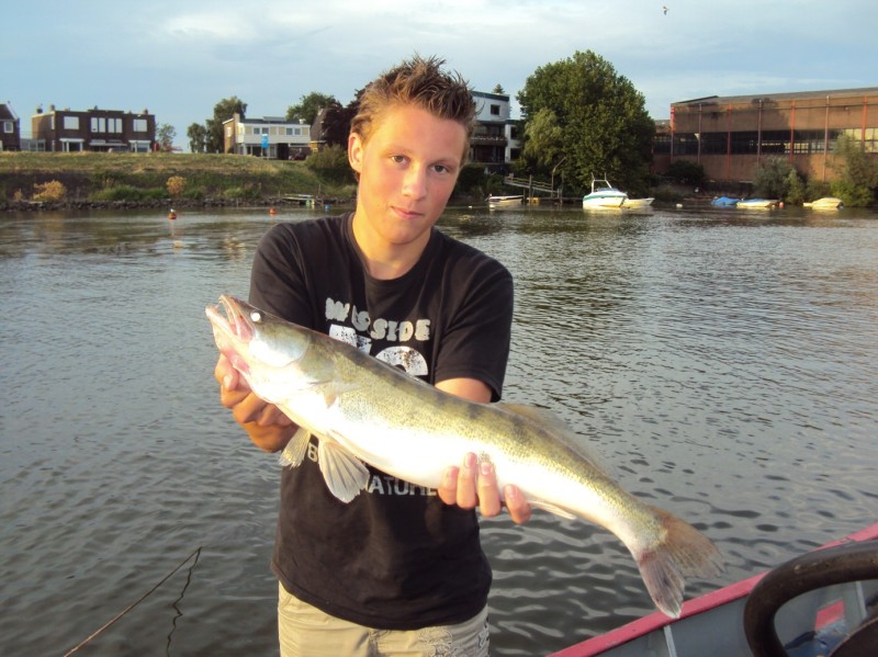 Vorige week zondag sprak ik een vismaat, Marten, en hij vroeg of ik weer eens wilde gaan vissen op snoekbaars. Ik zag dat wel zitten en de afspraak werd gemaakt voor afgelopen vrijdag. Om 6 uur stond ik bij hem op de stoep om aasvisjes te gaan vangen. Zo gezegd, zo gedaan, ongeveer 15 voorntjes van afmetingen tussen 7-12cm gevangen en we konden vertrekken. Hengels mee, net mee, tangen e.d. mee. De stek was al bekend, we hebben hier vaker gevist en dat is steeds goed bevallen dus waarom een andere stek opzoeken…? Aangekomen worden net en tangen klaargelegd en kunnen de hengels ingelegd worden. De keuze tussen voorn of voorn als aasvis is snel gemaakt en met 2 haken in hun lichaampje worden ze gelanceerd richting de bodem van de Merwede. Het is half 8 en het wachten plus gezellig ouwehoeren kan beginnen. Na ongeveer een half uurtje komt de broer van Marten met zijn nieuwe boot voorbij gevaren die moet natuurlijk door broerlief even bewonderd worden, terwijl mijn maat weg is slaat mijn hengel dubbel, ik wacht even en sla aan… RAAK!! Ik roep Marten terug en hij komt kijken wat er aan de hand is ik zeg: ‘Ik heb er een, schep jij hem even?’ hij staat al klaar met het net als de Zander aan de oppervlakte komt kijken en snel schept hij hem uit het water. Mijn ‘prooi’ wordt snel ontdaan van de hoofdhaak, de dreg heeft hij niet aan geraakt, en de trotse vanger mag even poseren met de vangst.