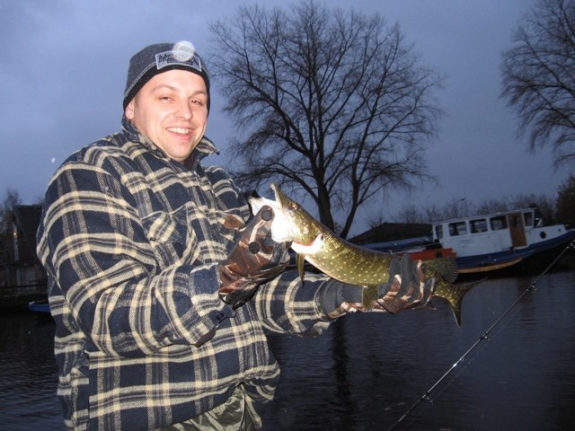 Maar daar lagen zoveel afgestorven planten in het water dat we om de paar meter het kunstaas moesten ontdoen van allerlei rotzooi.Ralf stelde voor om nog één keer naar de magische 150 meter te gaan en daarna te gaan.Op de weg ernaar toe kreeg Ralf een mooie aanbeet en vroeg me om de snoek te scheppen.