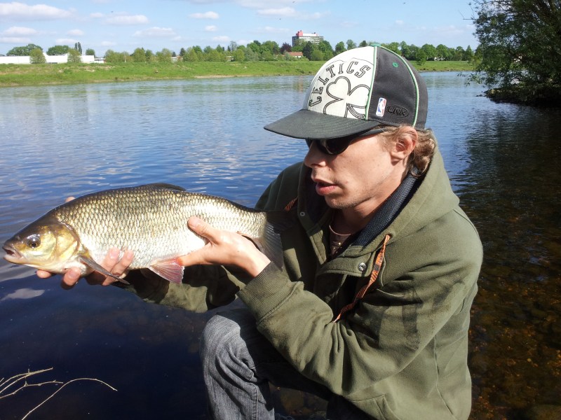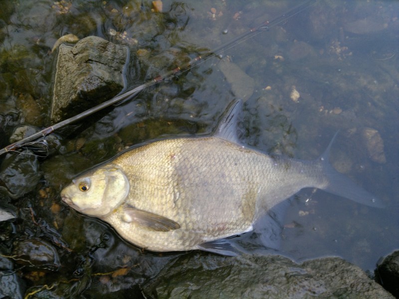 Woensdag avond met een vismaat afgesproken om met klein kunstaas op Baarste gaan vissen op de Maas . Ik begon met een kleine 10 grams rood-witte spinnervan Spro .Na een paar worpen voelde ik dat er een vis aan hing maar het voeldeniet echt als een aanbeet. Het was al vrij snel duidelijk dat het om eenvals gehaakte Brasem ging . Dat heb ik weer ! Het maakt niet uit hoe of waarop ik vis het lijkt wel alsof mijn haakjes als een magneet Brasems aantrekken.Eenmaal aan de kant was het wel een leuke verassing dat deze Brasem gedeeltelijk' two-tone' was .