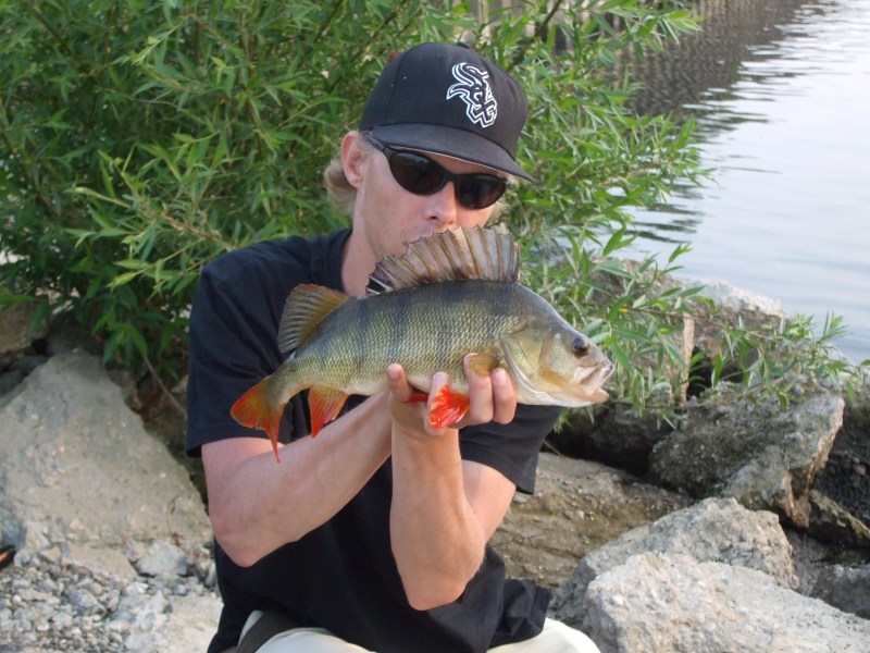 Na die losser van woensdag moest en zou ik donderdag avond terug gaan voormijn revanche .Het waaide een stuk harder en het was behoorlijk bewolkt ,ideaal visweer dus ! Dit keer ging ik met het waadpak aan zodat ik door konlopen tot aan het talud en zo strak langs het talud kon vissen en ookminder kunstaas verspeelde . De eerste 2 uur probeerde ik van alles maar devissen dachten er schijnbaar anders over . Eindelijk begon het te schemerenen werden mijn kansen op het vangen van een Snoekbaars groter . Met een diepduikendplugje van Salmo begon ik over de bodem te schrapen en al snel volgde eendoffe beuk , typisch Snoekbaars ! Maar ook deze vis loste . Niet veel laterwas het dan wel raak en een mooi formaat Snoekbaars bleef aan het plugjehangen . Gellukig was er een vriendelijke karpervisser in de buurt die weleven een fototje wou maken . Ik probeerde nog even of er nog meer vissenwilden bijten.Maar toen het harder begon te regenen besloot ik om maar naarhuis te gaan .