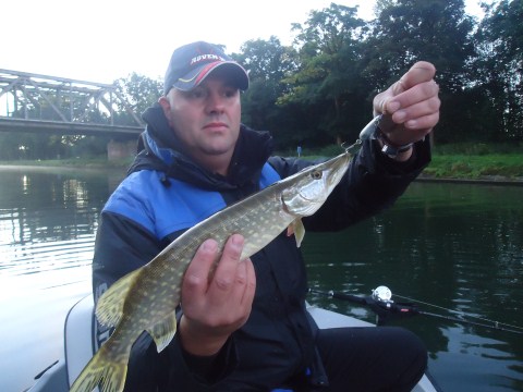 Vanmorgen zijn Robin en Ik even een paar uurtje shet kanaal opgeweest.Het plan was om een keer met wat groter aas als Hornets en Chibi shads te gaan trollen.Dus triple devils,Arukushads,enz...kwamen onder aan de speld te hangen.Na een minuut of tien weet Robin zijn eerste vis te verleiden op een Arukushad.Meteen weten we dat het geen baars is,maar wat dan? Een snoek blijft lang onder water voor dat hij zich laat zien.Effe op de foto en vooruit maar weer.