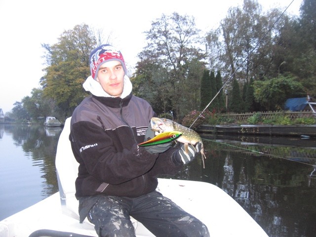 Toenb ik hem zei dat ie achter de boot helemaal zijn eigen weg volgt,door stroming enz. besloot ie toch maar met deze nieuwe plug te gaan trollen.En niet onverdienstelijk!!