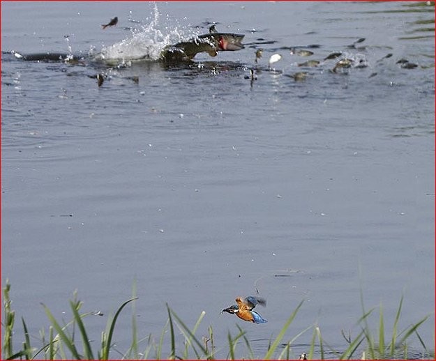 Eénmaal op ons "goede"stuk aangekomen te zijn zien we om de paar seconden 20-30 voorns de lucht invliegen met de snoek erachteraan.Hier wordt gejagen .........maar niet op kunstaas.Een lokale bewoner weet te melden dat het met levend en dood aas tevens niet wil lukken.Toch blijven we gooien en dan......JOOO Hangen.