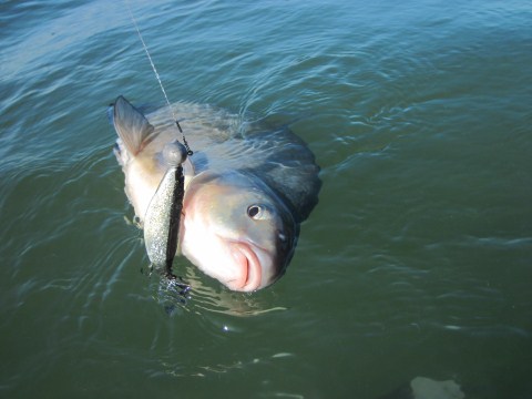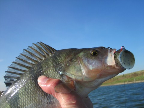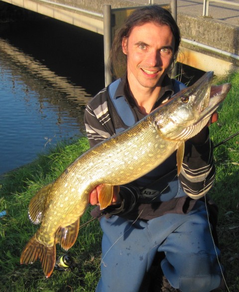 Gras dat van de overkant komt, is altijd groener - en dingen die van ver komen, zijn altijd beter. Dat zijn van die volkswijsheden die iedereen kent en vaak ook gelooft. In mijn visserij kan ik ervan meespreken: ik zit soms 4 uur in de auto om 5 uur te gaan vissen... Ideaal is dat toch niet, en dus probeer ik tegenwoordig om almaar dichter bij huis een goede stek te vinden. Dat valt niet mee, zo bleek tot nog toe, want veel van de wateren in mijn stuk van Gelderland lijken een slappe tot zelfs slechte roofvisstand te hebben.... Andere vissers vertellen me altijd dat dat de schuld is van beroepsvissers met elektriciteit, of van Duitsers, of van Polen, of van aalscholvers - enfin, jullie kennen de 'usual suspects' wel. Ik neem dat altijd met een korreltje zout, maar kan toch niet ontkennen dat het niet altijd meevalt om iets met tandjes te vangen vanaf de kant in mijn buurt. Onder het motto "de aanhouder wint" ben ik vanmiddag voor de eerste keer naar een kanaal geweest op een steenworp van mijn huis (bij wijze van spreken dan, tenzij je héél ver kunt gooien)... zonder veel vertrouwen, want het was heel zonnig & ik heb al vaak moeten ondervinden dat roofvissen daar niet zo heel erg van houden. Gelukkig bleek ik me te vergissen, want ik kreeg al vrij snel na aankomst een harde beet op mijn shadje, die ik echter miste. Een paar worpen op dezelfde stek later kon ik de 'schuldige' arresteren: het was een dikke baars. Honderd meter verder klapte er weer eentje op - weer een mooi getekende baars van 30 à 35 cm - het leek een broertje van die andere. Daarna bleef het een poosje stil, op een grote brasem na dan, die zich best wel fel verweerde! De haak van de shad zat net naast zijn bek, in zijn kin, eigenlijk - ik ben ervan overtuigd dat hij er wel degelijk naar had gehapt: een rasechte roofbrasem, dus. Net voor ik weer naar huis moest (kinderen ophalen bij het kinderdagverblijf) kreeg ik nog een hele brede snoek van 85 cm aan mijn lijn. Een voorbijwandelende dame-met-hondje was zo vriendelijk om deze groene rover voor me te fotograferen... Vier vissen in een uurtje of drie - dat begint er al op te lijken vind ik! ik zet mijn speurtocht dus naarstig verder... Tight lines!