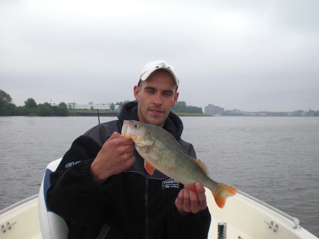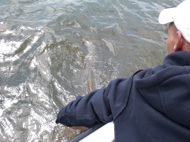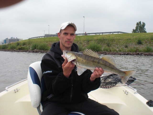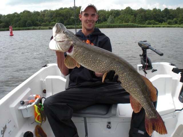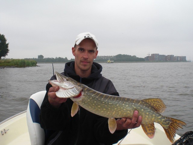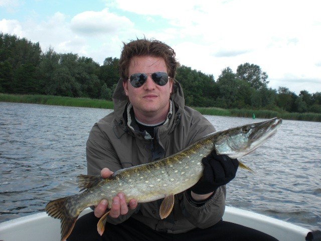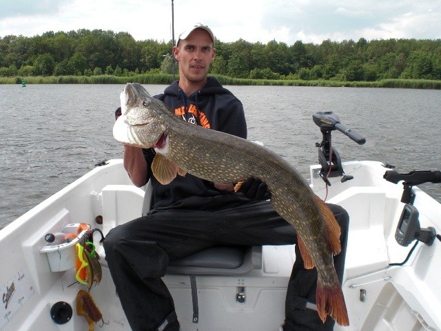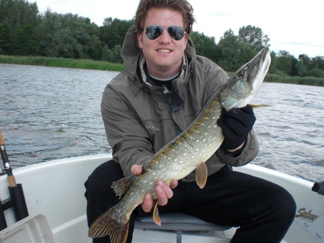 Alles lag al klaar in de auto,accu's zaten weer vol en na een stop bij de ESSO-pomp de lunchbox ook!Trollen met groot lomp kunstaas,dat was de strategie voor vandaag.Aangezien het vorige keer erg goed werkte met 7 snoeken in de boot waarvan 3 meters.Het vertrouwen in het water zat wel goed!Om 7.45 uur boot traileren,bulldwags aan de spelden en trollen met die schuit.De wind was een aanzienlijk stuk sterker dan vorige keer en ook een malse regenbui was ons vorige keer bespaard gebleven.De eerste uren verstrijken zonder vis of aanbeet.Hhhmmmm,wat nu??Nog een keer de zelfde stekken pakken en rustig de plantenbedden verkennen.En dan is het toch weer raak op de Bulldawg.Bas haakt op het 30 cm lange stuk rubber tractorband een mooie 75 cm felle snoek,die na een korte dril effe de boot van binnen mocht bekijken.Foto maken,en terug in het water maar weer.