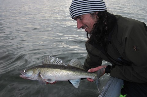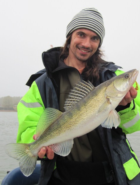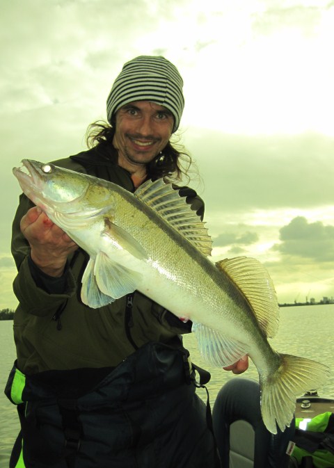 Gisteren eindelijk weer eens wat langer kunnen gaan vissen en het was nodig ook: er lag verdorie een centimeter stof op mijn boot! Van vrienden had ik goeie berichten gehoord over de grote rivieren, en dus lieten we de boot vol goede moed het stromende water inglijden. Het was niet druk op de helling: we zagen slechts twee andere trailers. Binnen 15 minuten had ik al vier vissen en één misser: alles op heftige flankende schoepstaartjes in een fel paars kleurtje. Mijn vismaat viste met een of ander gedrocht van een shad die hij zelf gegoten had, maar daar hadden ze toch nog niet veel zin in merkten we. Hij bleef echter stug doorvissen en uiteindelijk begon ook zijn winkeltje te draaien. Misschien waren de vissen aanvankelijk zo hard geschrokken van zijn creatie dat ze er pas na een poosje niet meer van wegzwommen. Het bleek een superdagje te worden: we kregen uiteindelijk 54 snoekbaarzen (tot zo'n 65 cm) op bezoek in de boot en misten er nog een stuk of 20 ook. Hoe ze dat doen, snap ik nog altijd niet: een shad waar vier haakpunten uitsteken (een dreg en een loodkop) en waar je bij wijze van spreken niet aan kunt ruiken of je hebt al een haak door je snufferd - en zij knallen er loeihard op "like there is no tomorrow" en ze doen dat ongestraft! Ooit wil ik onderwaterbeelden zien van wat er nu eigenlijk gebeurt... Er waren duidelijk twee aasperiodes: de voormiddag, en dan de laatste twee uurtjes voor de schemering. 's Voormiddags leek hun appetijt vooral uit te gaan naar schoepstaartshads, 's avonds hadden ze volgens mij meer trek in een lekker vorkstaartje. Aan de trailerhelling kletste ik nog wat met de twee Duitsers, die ook de hele dag gevist hadden. "Etwas gefangen?" "Jah, gut! 5 oder 6 schöne Zander!" Ik hoop voor deze jongens dat ze aan het liegen waren ;-) tight lines!
