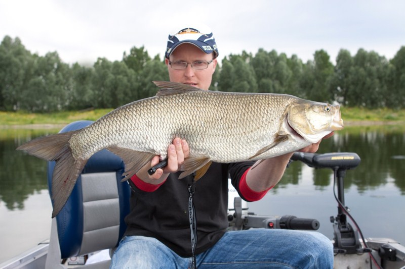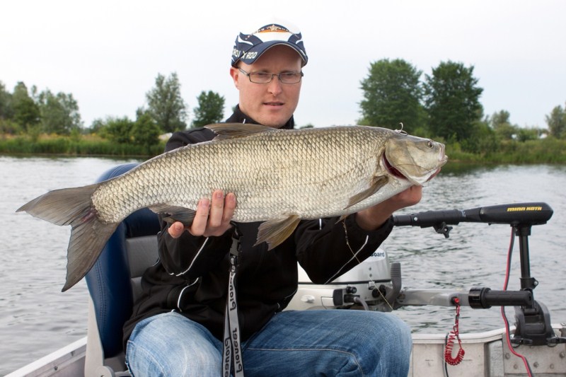 Dit stuk ben ik nog eens opnieuw gaan pakken en op de zelfde plek kreeg ik weer een flinke beuk op de Bill Trill. Helaas schoot deze snoekbaars aan de oppervlakte eraf.Snel besloot ik met trollen te stoppen en ben ik dit hele stuk gaan afdriften zodat ik meer water dekte, helaas geen aanbeet.Wat ik wel op de visvinder zag dat er steeds een groene streep uit het groen kwam en tot de helft van het water dook hij weer terug. Dit signaal hebben wij ook als we aan het kwakken zijn op de meerval. En dit geeft heel duidelijk een meerval signaal aan.Toen ik dit een paar keer zag heb ik een zinkende Spro screaming devil eraan gehangen van 65 gram en ben ik hier mee aan de slag gegaan. Wie weet komt hij op het geluid af.... Toch gaf dit geen stoot en ben ik verder gegaan naar een ander stuk.Ook hier stond er enorm veel groen, en besloot ik te gaan driften boven 5 meter water, fijn met de electromotor door het groen zodat ik de vis zie aankomen.Hier en daar zag je wel grote windes en roofbleien jagen in het oppervlakte,ook vlak langs de boot.Op dit moment was ik met de jerkbait, de Spro Rapper, aan het gooien.Een ideale jerkbait die langzaam zinkt en die je net een halve meter onder het oppervlakte kan vissen, 2e worp een dreun Yes dacht ik snoek. Eenmaal aan de boot gekomen was deze gegrepen door een roofblei. Geweldig sport gaf deze, en binnen enkele minuten kon ik hem in de boot landen.