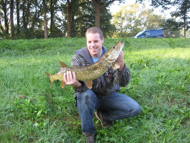 Half 7 gingen mijn ogen open, snel aankleden enz en dan zo snel mogelijk naar de waterkant. Doelstelling van vandaag, snoek vangen op mijn nieuwe jerkbait stokkie. Eerst nog ff koffie en de hondjes uitlaten, de hengels en zooi in de auto en wegwezen. Half 8 keek ik uit over een mistig maar super glad stukkie kanaal, eerst maar eens een paar proefworpen, voor de eerste keer vissen met een reel.Na een worp of 10 genoeg vertrouwen erin,dus knopen we er een Spro rapper aan. Deze rapper heeft de bijnaam "Robbie" gekregen van mij.Ik heb hem laatst van Rob gekregen toen ik in zijn "kunstaasshop" in zijn schuur aan het neuzen was.Toen kreeg ik hem en vanmorgen belde ik Rob op dat ik een dikke snoek ermee ving,en nu wil hij hem hem terug hahaha. Ik gooi me een uur lang helemaal suf, maar vang niks.Uiteindelijk kom ik bij een sluis uit, waar een witvissertje zit. Ik pak mijn hengel uit de auto en wordt al snel geroepen door de beste man.Hij heeft last van een snoek, of ik die even een lesje wilde leren. Ja hoor geen probleem, na een worp of 10 zie ik de snoek er vol op klappen. Nu merk ik nog meteen een voordeel van een goede reel, je kan gewoon de vis afremmen met je duim. Na een paar minuten had ik de vis op de kant, ff gemeten en een foto, hij was uiteindelijk 89 cm en modder vet.Een stuk verder heb ik nogmaals beet gehad vanzo'n groene rover maar deze loste zichzelf!Iedereen goeie vangsten dit weekend.Henry