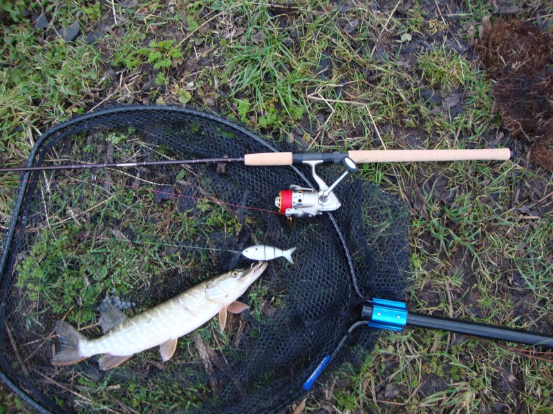 Na een keer of wat gooien vang ik na een korte minuut of vijf mijn eerste snoekje. Lekker goed voor het vertrouwen zo!! Een snelle bevestiging dat alles goed zit. Ik zie dikke snijwonden veroorzaakt door grotere broers of door de aalscholver. Ook heeft dit kleine boefje de bovenvin van mijn aas afgereten. Snel terug jij.