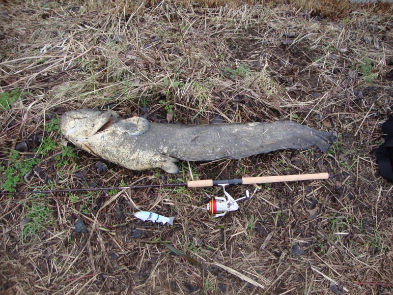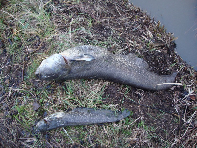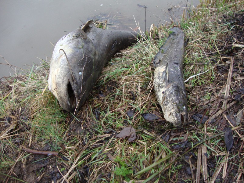 Na nog een stuk gelopen te hebben spot ik er nog één. Nog groter als de eerste 130cm echt niet te geloven. Ook dood en wat een slecht gezicht zo. Ook een kleinere meerval zie ik drijven. Ik wil er foto's van denk ik want dit gelooft niemand anders. Dit bedenk je niet, echt zonde.