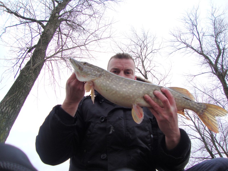 Dan begin ik hier en daar dode brasem en karper te spotten. Ik denk door de weersinvloeden van afgelopen tijd. Toch best grote exemplaren voor dit kleine polderwater denk ik nog.Ook zie ik twee dode snoekjes drijven. Zonde denk ik. KLAP... een mooie snoek hapt vol in mijn BBZ-1,