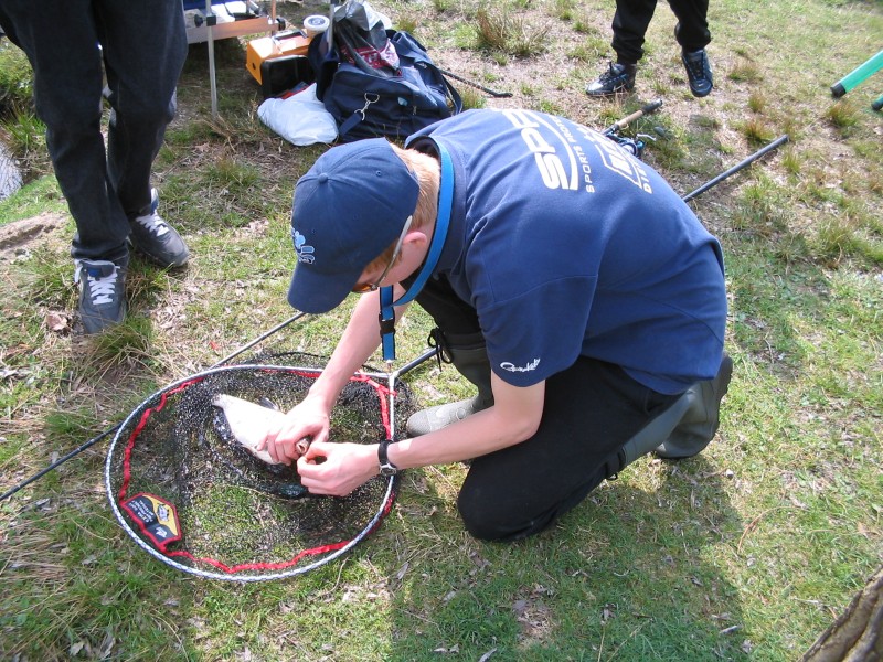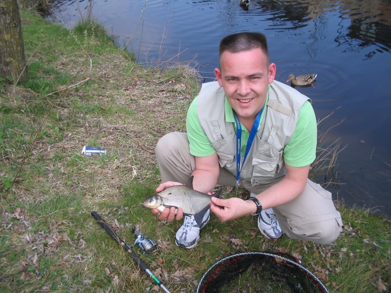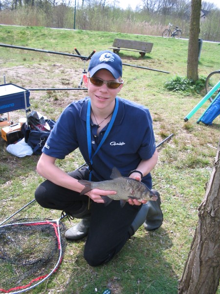 Als uiteindelijk ook ik geïnstalleerd ben sta ik al op achterstand want Edje heeft de eerste kleine voorntjes al in het net liggen. We besluiten beiden met de feeder en de vaste stok te vissen en hebben al gauw met grote regelmaat beet. Edje probeert een nieuw feeder systeem uit terwijl ik op oude en vertrouwde methoden teruggrijp. Al snel weet ik vis te landen maar de grotere brasem en karper melden zich nog niet als plotseling de feederhengel van Edje met een plons in het water klettert. "Zie je wel, dat spul werkt de hengel is uit de steun gerukt." Meld Edje, grijpt de hengel en slaat aan... "KARPER... sh... los". Tien minuten later zit hij nog na te trillen van de adrenaline. Ik plaag met dat hij z'n hengel zelf omgestoten heeft en nu nog zit te trillen omdat hij bang is dat ik het gezien heb als even later hij weer uit alle macht aanslaat en dit keer de haak met succes zet. Ik zit ondertussen de kleintjes in het net te zetten terwijl Edje zijn eerste vis van formaat drilt (van de ander kant van de vijfer gehaalt duurt het ook even moet ik zeggen). Uiteindelijk schiet ik dan toch even een plaatje van de vangst, die er overigens wezen mag. Niet helemaal puntgaaf maar een mooi exemplaar.