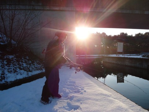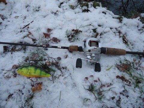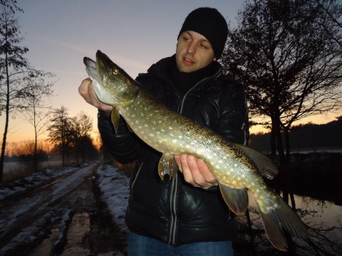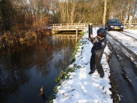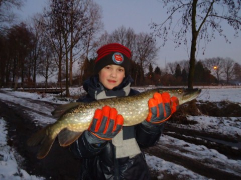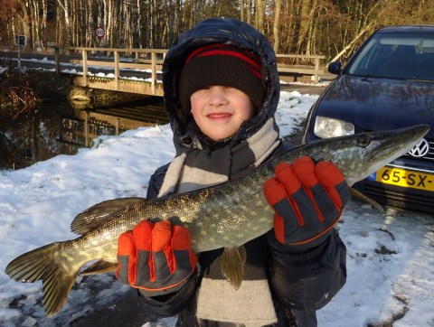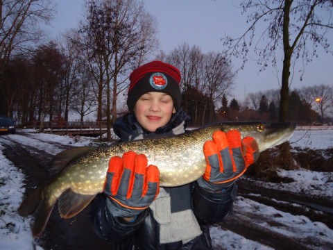 Mijn zoontje gaat zomers wel is mee op de boot om baarzen te vangen.Op "zijn" stoel zit meneer dan lekker in de zon en vangt zo met regelmaat mooie vissen.Nu wilde hij na mijn laatste snoekavonturen ook is mee vanaf de kant gaan vissen.Dus na het werk even eten,warmtepakken aan en gaan!Eerst even naar de haven om al dropshottend een baars te vangen...maar dit resulteert in niets.Dus auto in,10 minuutjes rijden,de Real Eel aan de lijn en gooien.Bij mijn tweede worp duikt er een snoek op de paling maar mist.Ik werp weer in,geef de hengel aan mijn kleine man en hij draait binnen.In het heldere water zien de snoek van de grond komen en hij kan beginnen aan zijn allereerste gevecht met een snoek.Hij geniet,ik geniet en na een korte dril pak ik de vis uit het water.
