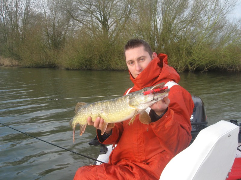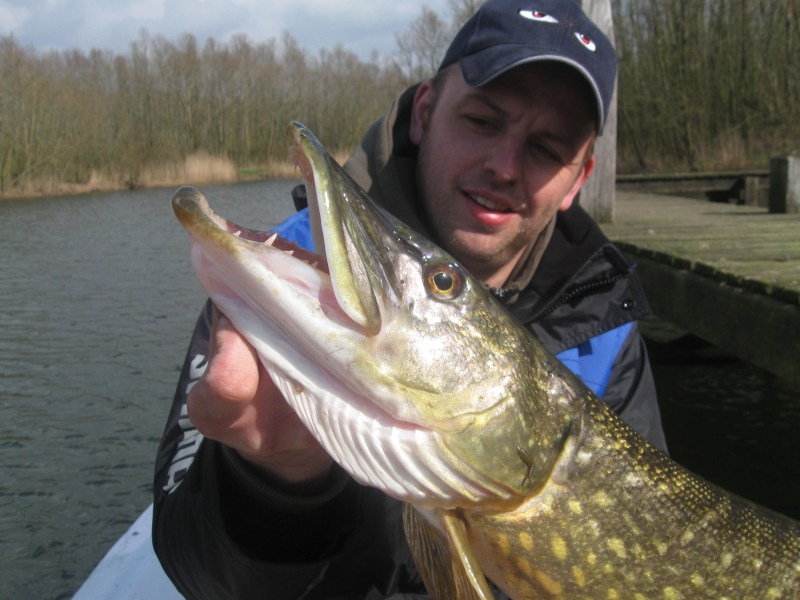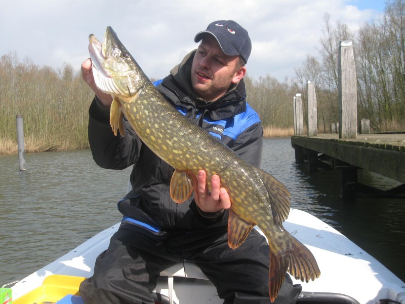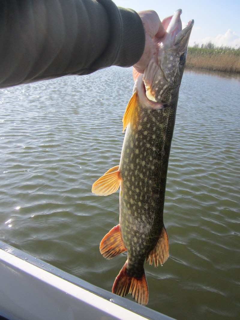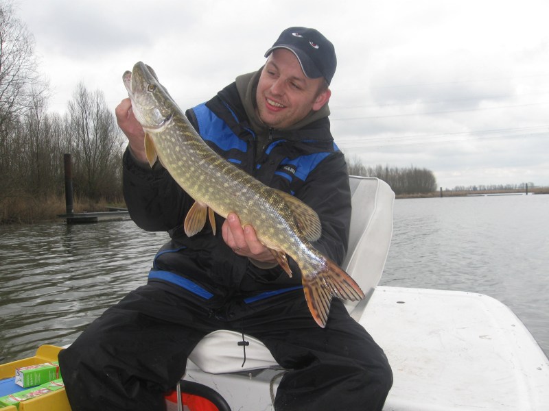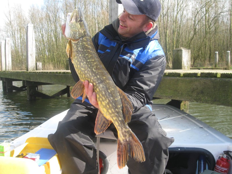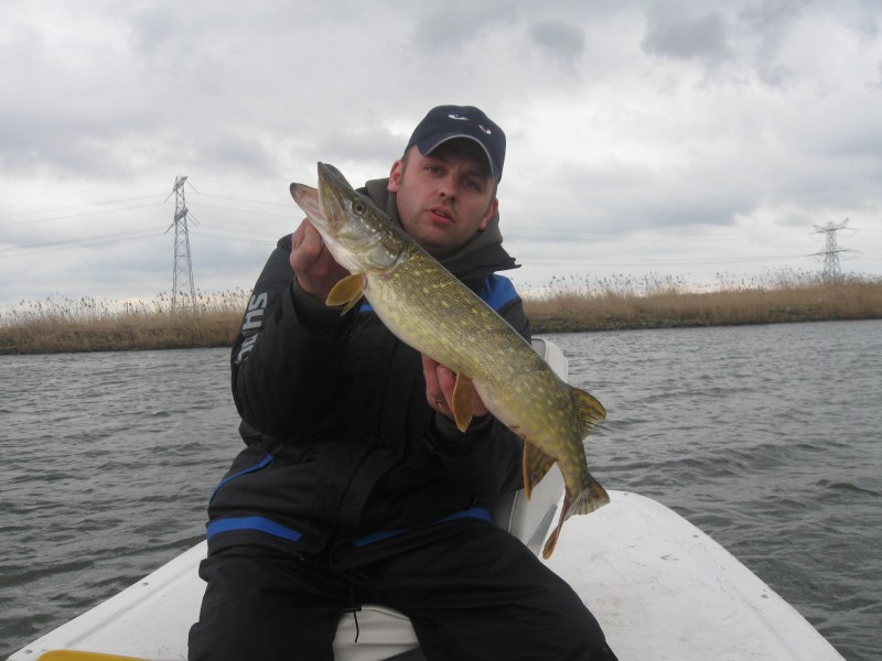 We varen de binnenwateren een keer uit en zoeken Robin nog is op.We krijgen controle voor de vispassen en Robin krijgt een waarschuwing voor een derde opgetuigde hengel..Bij ons staan er zes opgetuigd klaar,maar wij horen niets!Wij gaan een plas op en robin achtervolgd ons,wij draaien op het midden om maar Robin gaat door.Met succes.Een moddervette snoek van 80 cm klapt op zijn 14 cm Fatso RHP.Omdat hij alleen in de boot zit kan hij moeilijk foto's maken maar de vette pens is zeer duidelijk te zien!
