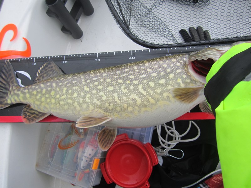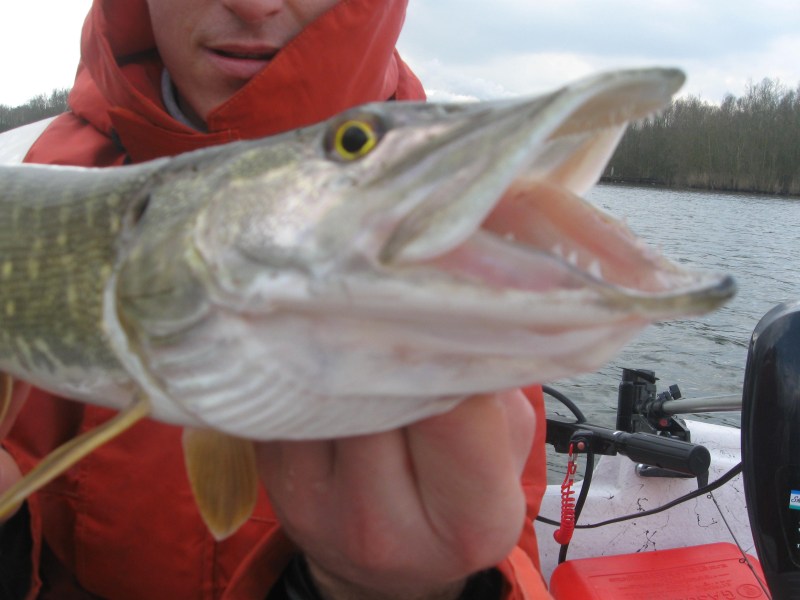 Wat een dag hebben we vandaag beleefd,een dag met mooie dikke vissen,spectaculaire aanbeten en heerlijk weer.Het is 5.15 als Robin met zijn boot voor de deur staat.Gauw alles in de auto laden en naar Eric toe,Robin rijdt meteen door naar de plek van vandaag.Eric en ik moeten de Skiff nog gaan halen,dit is vlot gebeurd en zo staan wij ook om half acht aan de helling.De boot wordt geladen en omdat de benzinepomp dicht was,maar als ontbijt een broodje bal uit Eric's keuken.Motor loopt ondertussen warm en het gas gaat erop,met 40 km per uur naar stek 1.Eénmaal daar worden de hengels beaast,Eric gaat voor de Grandma en een Savage gear,ik start met de triple devil en een Rapala JSR.Na een minuut of tien trollen ratelt Eric zijn reel en merken we dat een snoek "oma "heeft gegrepen.Ik film de dril en maak wat foto's.De vis is flink gehavend,meerdere snijwonden aan de buik,waarschijnlijk een conflict met een soortgenoot!Ook zit de snoek onder de bloedzuigers,een teken dat ze op de grond liggen..