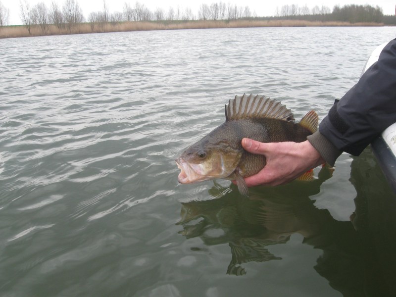 We bellen Robin ondertussen en meren met zijn drieën een keer aan, om wat te eten en drinken.Het is pas een uur of elf dus op zich gaat het goed.Na de time-out gaan we weer op pad,de Fatso blijft hangen en de hornet wordt gewisseld voor een triple pikefighter.We varen langs een rietkant en pakken de buitenbocht,dan slaat mijn steunhengel met geweld krom,de steun gaat zelfs mee.Ik pak de hengel en zie meteen een grote ronde bek aan komen zwemmen met een Fasto ertussen.....Een baars,en wat voor één!! Een kogelronde 48 cm lange Perca komt de boot is aanschouwen en gaat meerder malen op de gevoelige plaat.Wéér een nieuw PR dit jaar verbrijzeld!!