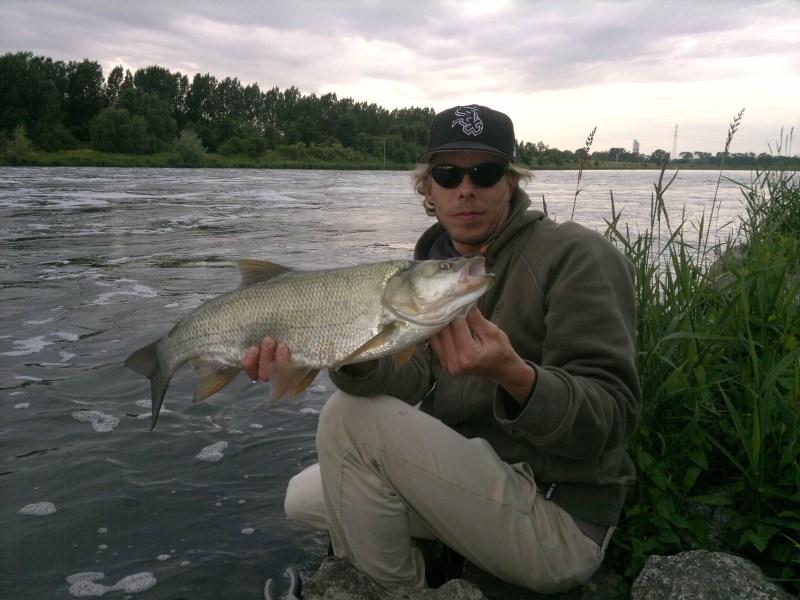 Afgelopen woensdag had ik met Tim afgesproken om de vissen op de Swalm een slechte avondte bezorgen.Eenmaal aangekomen bij de Swalm zagen we dat het water de kleurvan koffie had ,van alle regenval van de laatste dagen.Het kleine riviertjestond ook een tiental centimeters hoger dan normaal en stroomde als een tierelier.Het was de bedoeling om met de UL hengel en klein kunstaas kopvoornof forel te vangen.Meer dan 2 uur lang werd elke potentiële standplaatssecuur uitgeworpen.Helaas gaf er geen visje thuis. Omdat het al vrij snelduidelijk was dat we op de Swalm weinig succes zouden hebben besloten wete verkassen richting de Maas, in de hoop dat de Roofblei wel thuis zou geven.Tim moest eerst nog zijn roofblei hengel klaarmaken,ondertussen begonik met een klein blauw plugje te werpen.Na een 20-tal worpen klapte erheel onverwachts een roofblei op mijn plugje.De hengel werd bij de aanbeetbijna uit mijn hand gerukt,deze vis nam geen lange run maar bleef als eenbezetene vechten onder de hengeltop.Na een kleine 2 minuten vechten mochtik een leuk formaat Roofblei landen .