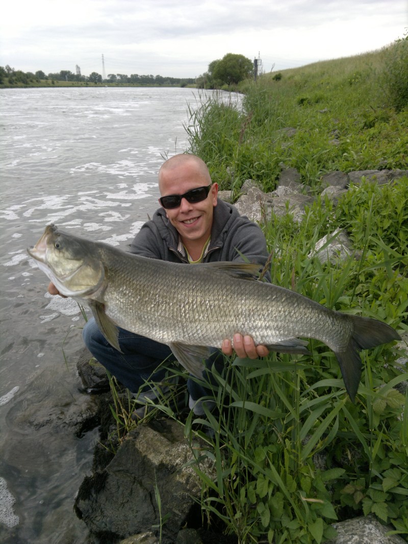 Toen deze vis was teruggezet kon Tim dan ook eindelijk beginnen met vissen.Terwijl ik met een sigaretje nagenoot van mijn vangst.Tim begon met eenRapala clackin' rap te werpen en al na een paar minuten hoorde ik hem vloekendat hij de Maas bodem gevangen had.Hij was duidelijk niet te genieten omdathij z'n favoriete kunstaasje verspeeld had.Maar zoals een echte visserliet hij zich hierdoor niet uit het veld slaan, en maakte snel zijn hengelklaar om verder te vissen.Nog geen minuut later stond hij alweer te werpenmet een klein zilveren plugje en niet veel later hoorde ik hem roepen dathij een Roofblei te pakken had.Snel haaste ik me naar Tim,eenmaal daaraangekomen was het meteen duidelijk dat het hier om een dikke Rapf ging.Eenpaar minuten later mocht Tim dan ook een flinke Roofblei landen.Vlugschoot ik wat foto's en na meten bleek deze vis 75cm te zijn, zijn nieuwePR Roofblei !