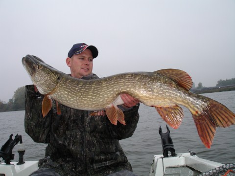We werpen verder maar krijgen hier niks meer gevangen.Op naar een andere stek waar Harm al gauw trollend met de Shad Clone een mooie snoek vangt van 91cm. We trollen nog wat verder,maar geen aktie meer. De volgende stek word weer werpend gevist.Weer een talud met steile af loop naar een meter of 5. Aan het einde van de stek ,op het puntje, laat ik de Eel weer langzaam langs het talud de diepe in gaan.Bam!! Ja vis, een goeie roep ik! Een mooie snoek die de paling niet kon weerstaan .De paling is compleet verdwenen, geen paling meer te zien.De 40 cm rubber zitten totaal in de bek.Snel onthaken en meten :118 cm Rivier Power een lange maar slanke vis. Hierna hebben we niks meer kunnen haken maar de dag was geslaagd. En de paling test ook,mooi aasje om al jerkend de steile taluds mee af te werpen.