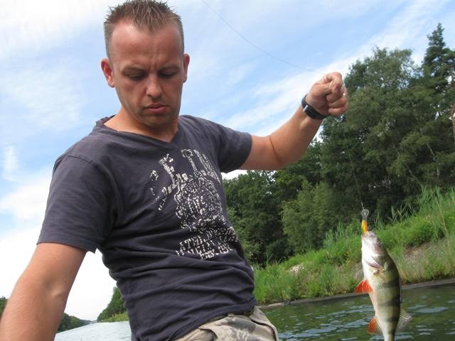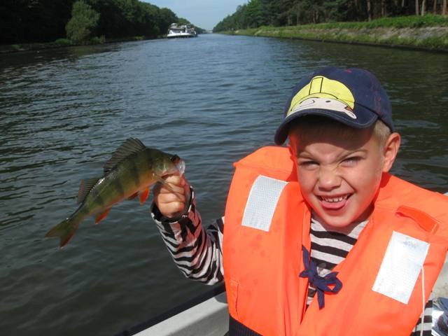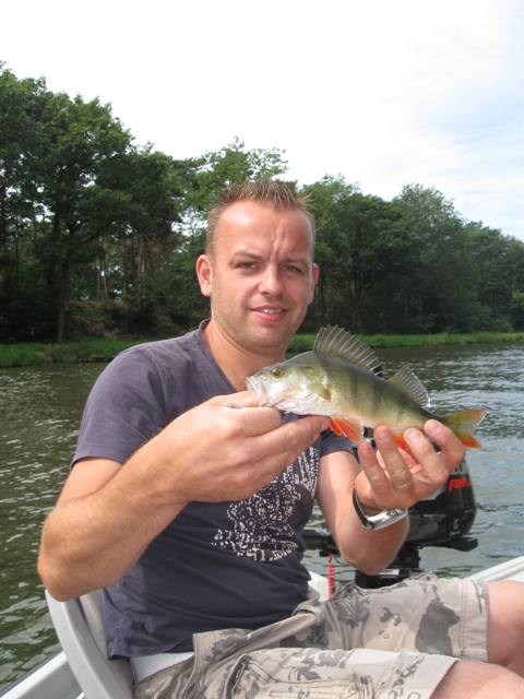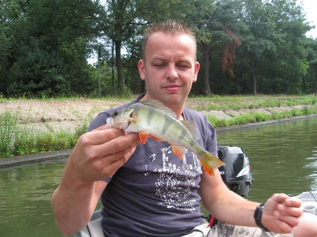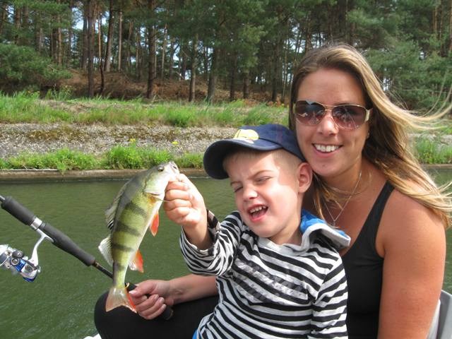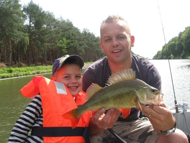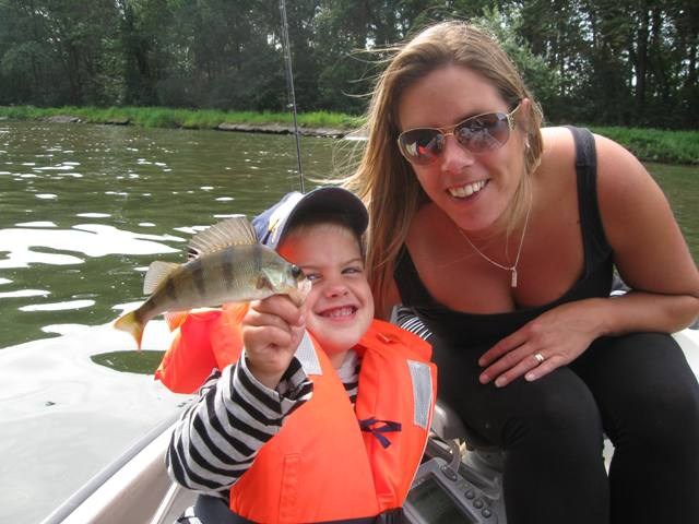 Donderdagochtend 9.30 schiet ik wakker.Balen ik had al op het water willen liggen.Maar alles komt goed.Ga vandaag met mijn vrouw en kleine man op pad.Mike zegt steeds" Tycho mag iedere keer mee en ik moet WEER bij mama blijven.Omdat Tycho is uit logeren gaan we met zijn drieën.Eerst maar effe ontbijten en alles maar op het gemak,we zijn toch al laat.!Om een uur of elf liggen we dan toch te dobberen op het kanaal.Vrouwtje heeft de krant te lezen,Mike speurt wat rond en ik knoop toch maar weer die vertrouwde hornet aan de lijn.Overboord ermee, en vrij vlug is het HANGUUUHHH! Mike vind het geweldig,pakt de baars in zijn bek en laat hem weer lekker zwemmen.