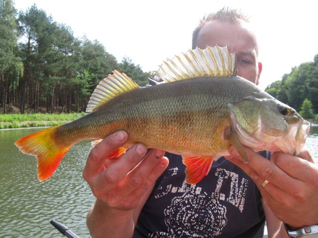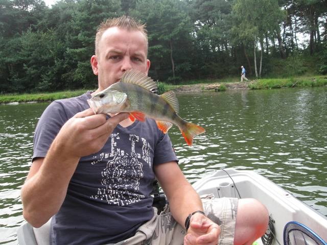 Ik vang op mijn gemakje wat baarzen en geniet heerlijk van de zon met de voetjes over de reling in het water.Tja tis toch vakantie.Als Mikey dan zegt dat ie moet plassen,stel ik voor om naar een viaduct te varen en even aan te leggen.Maar nee hoor,hoeft niet hij houdt het wel op.GELUKKIG!!!!!Ik trol een 50 meter verder en mijn spro diagonal dropshot'r van 1.80 en een werpgewicht van 3-14 gram staat krom,écht goed krom.Dit is een beste vis,ik zet de slip wat losser en laat de kanaal kanjer maar even uitrazen.Dan komt de dikke stekelkam boven water,schepnet eronder en pakken.Foto,meten en jawel hoor 44 cm!Met een dikke kus op zijn kop zwemt de vetzak weer terug de dipete in.Wat een vis,op twee meter uit de kant.Heerlijk!!Verder maar weer,ik pak nog wat baarzen en geef Mike mijn andere hengel.Streamer eraan maatje twee goud en de laatste drie kwartier vangen Mikey en mijn nieuwe vismaat (haha) 9 baarzen op de streamer,met een 32-er als bonusvis voor hen.We sluiten de sessie af met 22 vissen in de boot en een nieuw record wat al jaren op 43cm stond.Hé wat is uitslapen toch fijn!! ;-))Gr Rob