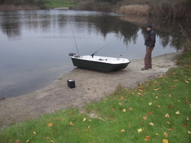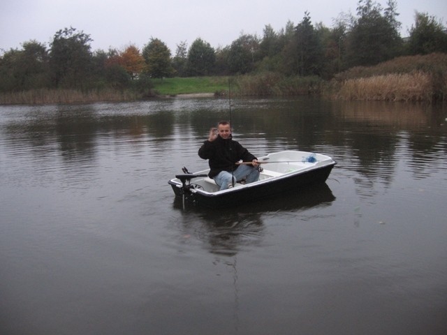 Eénmaal op de waterlaat was ie in 1 minuut "getrailerd" en hing de electromotor erachter.Wat nu nog....? zei ik tegen Ralf.Een accu en GAS erop zei Ralf en snoeken in die boot verdomme!!