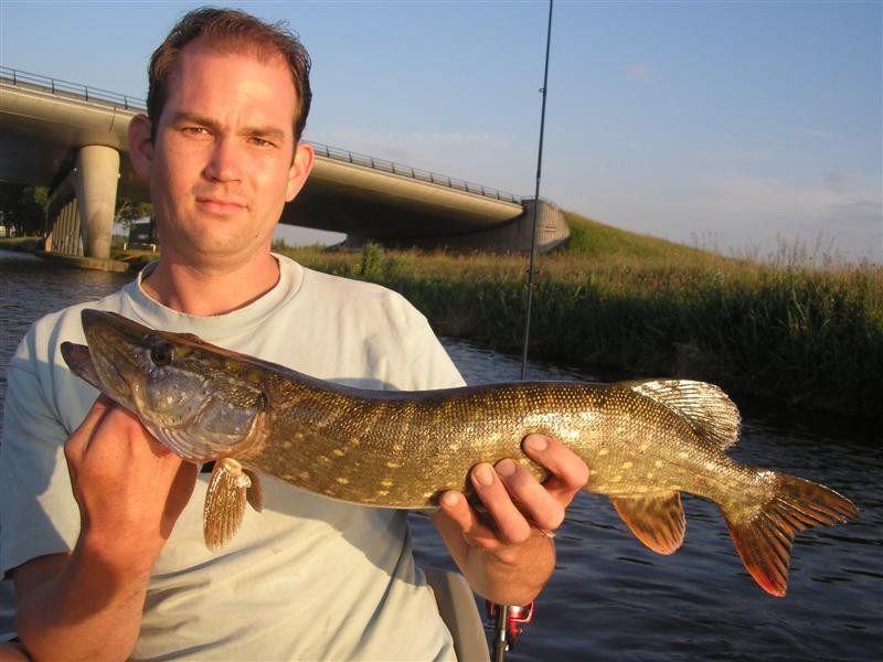 We trolde de Kanaal kant verder af wat een aantal Baarzen opleverde. Onder het viaduct krijgen we allebei beet maar kunnen niets haken. Op het moment dat we er onderdoor zijn klapt Patricks spinhengel krom, een heftige dril volgt. Het is een felle Snoek van ongv. 65cm de Snoek springt verschillende malen uit het water, op het moment dat ik hem wilde pakken sprong hij zelfs spontaan in de boot!!