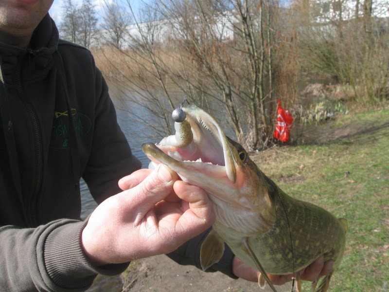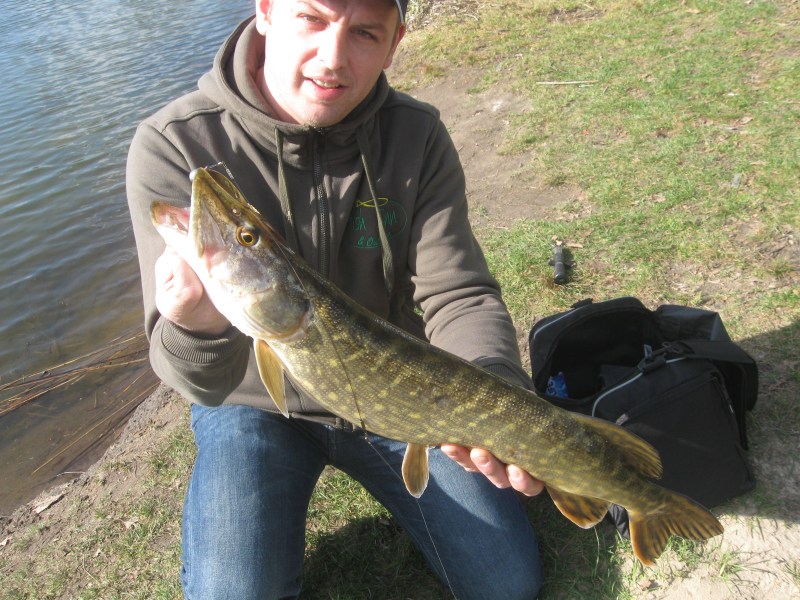 Een zinkende slamo slider hangt met stalen onderlijn vast gehaakt in mijn shad.Hoppa,weer een plug in mijn toch al veel te grote kunstaascollectie!We werpen weer wat verder en Robin gaat op een gegeven moment huiswaarts.Ook 4 jonge vissertjes gaan naar huis,ze vonden het zeer interessant hoe dat snoeken ging.Ik werp wat verder op een andere stek en krijg een aanbeet,gevolgd door een dikke kolk en een kapotte shad-staart.Yes,er zit snoek!De groen rover blijft een paar meter uit de kant aan het jagen.Eén van de vissertjes komt terug en vraagt of ik al iets heb.Ik tik de shad éénmaal omhoog en JA kan ik hem melden! Een snoek van 72 cm is over de Reins Fat Rockvibe geschoven.Ik dril de snoek naar de kant en laat het manneke een paar foto's maken.Release en verder maar weer